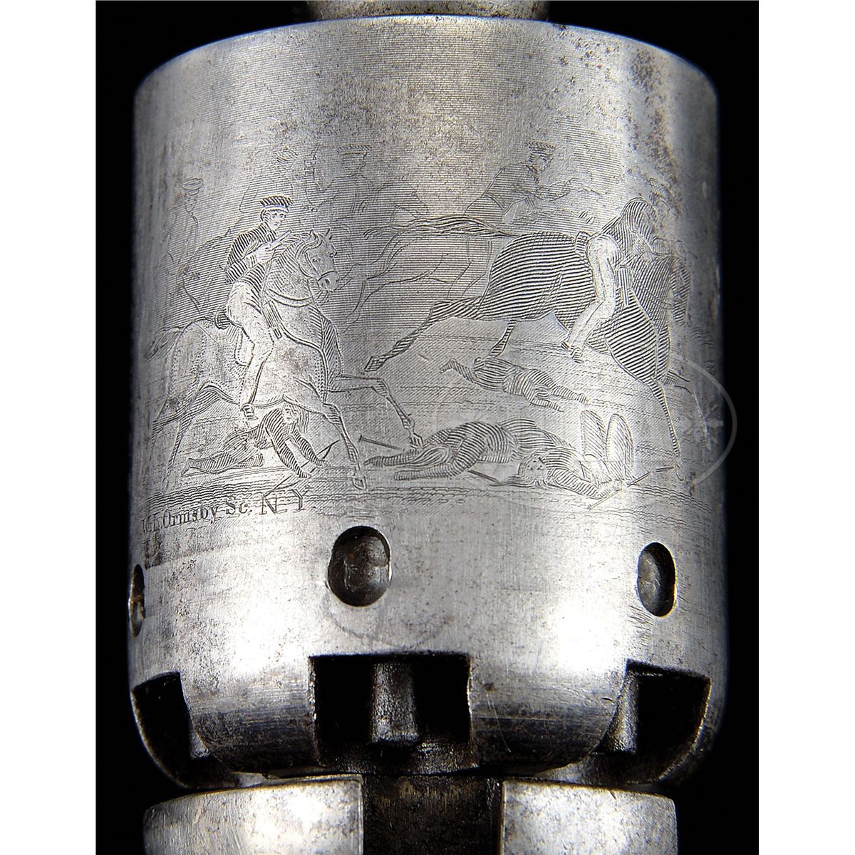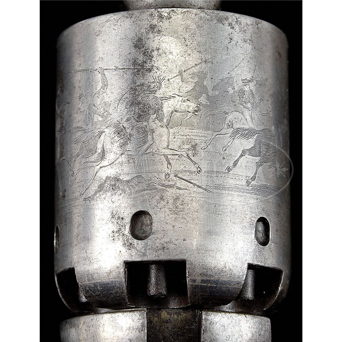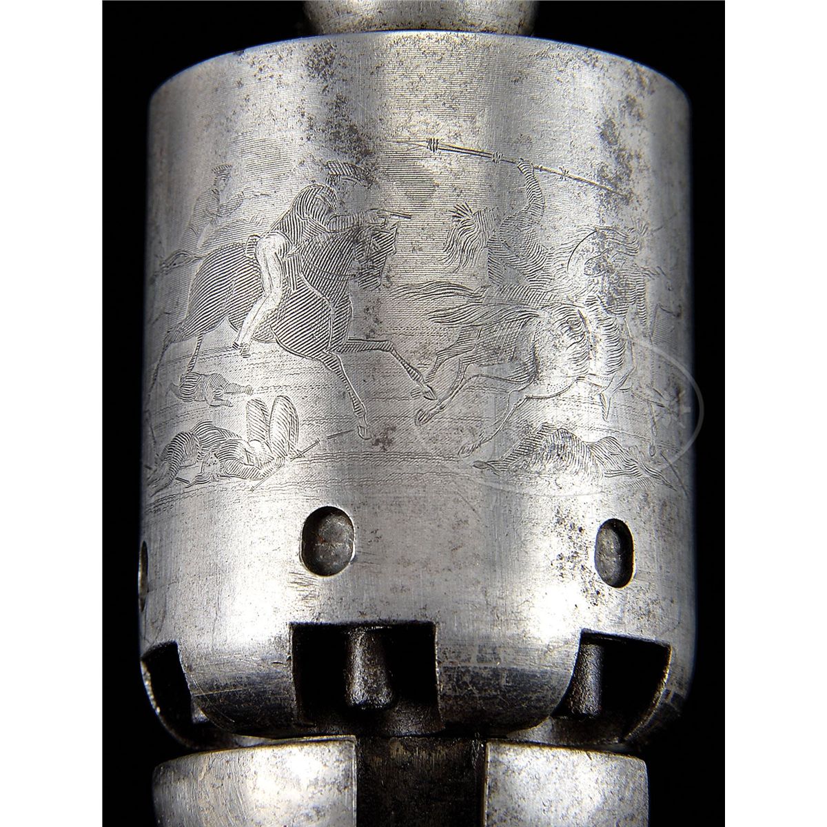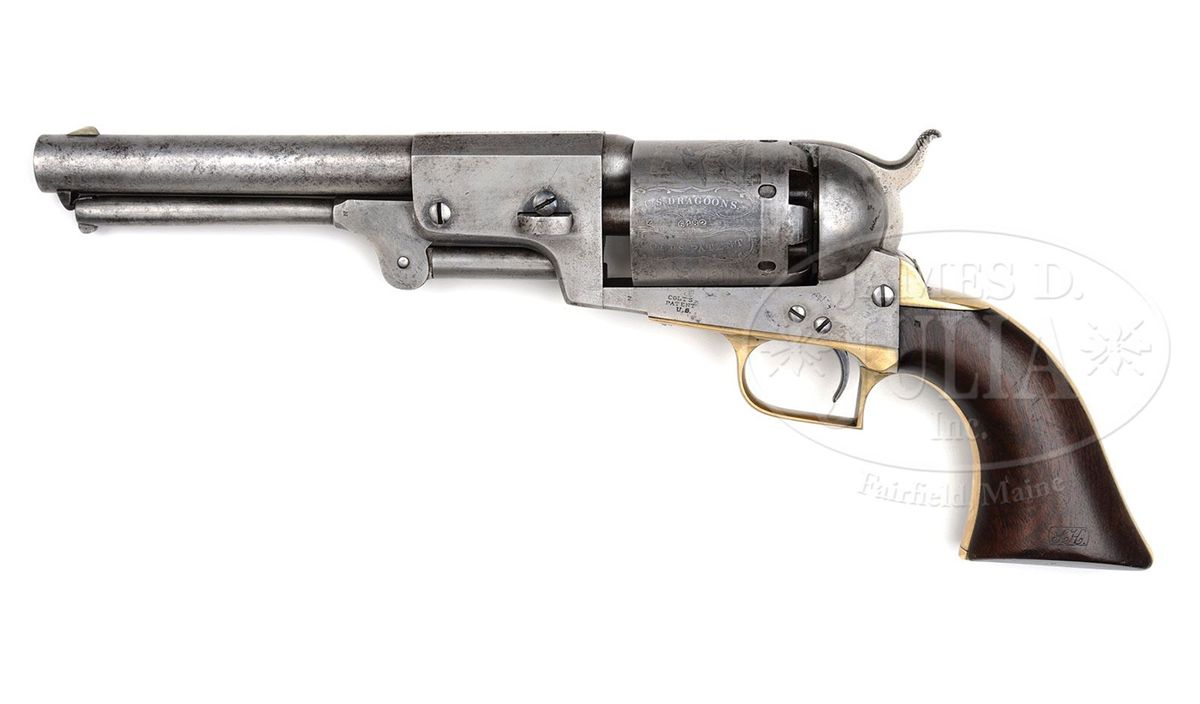 SN 6482. Cal. 44. Usual configuration with 7-1/2" oct to rnd bbl, German silver front sight and 1-line, left hand New York City address. Left side of frame is marked with a tiny "COLT'S PATENT" over a tiny "U.S." The square back brass trigger guard & back strap contain a 1-pc walnut grip with matching SN in the butt strap channel. Grip has a legible "SK" (Samuel Keeler) inspector cartouche on the left side and a "WAT" (William A. Thornton) sub-inspector cartouche on the right side. Various parts have small sub-inspector initials. Cyl is 6-shots with oval stop notches and its single prominent safety pin. Cyl has the Dragoon/Indian fight scene roll marking and the scarce "U.S. DRAGOONS" / COLT'S PATENT" panels surrounding the SN. It also has a partial pressure ridge. Accompanied by an outstanding "COLTS PATENT" Dragoon flask with plunger spout and "COLT'S PATENT" marked swinging cover ball chamber. Flask also has the "WAT" inspector initials and has low mounted, triangle shaped hangers. Additionally accompanied by a very rare russet brown leather military flap holster with tab closure and Cheyenne-style plug. 1st Model Dragoons are occasionally encountered but rarely with any cyl scene whatsoever or grip cartouches. PROVENANCE: Dr. John M. Pickup Collection. CONDITION: Fine, all matching except wedge which is unnumbered. Revolver retains traces of orig finish on the bbl with the balance having been cleaned to bare metal and has some very fine scattered pin pricks of pitting; frame, cyl & hammer are also cleaned to bare metal with scattered fine pin pricks of pitting; trigger guard & back strap are a medium mustard patina. Grip has chipped toes, otherwise is sound with moderately worn edges, a few nicks & scratches and retains a wonderful hand worn patina. Mechanics are fine, bright shiny bore, slightly frosty in the grooves. Flask has a repaired seam on the bottom with a slightly open seam on one side and retains a very dark copper patina. Holster is sound with a repaired belt loop, is dry & crackled on the flap but overall is serviceable and retains about 75% orig finish. Altogether a rare grouping. 4-46422 JR55