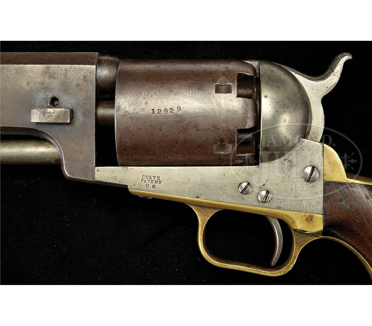 SN 12929. Cal. 44. Usual configuration with 7-1/2" oct to rnd bbl, German silver front sight and 1-line address with serifs at each end. Left side of frame has a small "COLTS PATENT" over a tiny "U.S.". The rnd brass trigger guard & backstrap contain a 1-pc walnut grip that has partially visible SN "29" in backstrap channel which is apparently the first part of "2929". Grip appears to be spuriously struck with a "JB" (probably for Joseph C. Bragg) cartouche on left side, struck vertically and a "WAT" (William A. Thornton) cartouche on right side, also struck vertically. This appears to have been a civilian revolver that someone attempted to turn into a military revolver not realizing that many civilian Dragoons were made with "U.S." marked contract overrun frames. CONDITION: About good, all matching including wedge & grip, wedge screw is missing. Traces of orig blue remain on bbl lug with the balance a mottled medium brown patina; rammer & handle are a gray patina; cylinder is mostly a medium brown patina and shows about 50% Dragoon/Indian fight scene with "MODEL U.S.M.R. / COLT'S PATENT" panels above & below the SN completely legible; trigger guard & backstrap retain a medium mustard patina. Grip has chipped toes and a couple of gouges on right; shows heavy wear and retains a handworn patina. Mechanics are fine, strong bright bore with scattered pitting. 4-48749 JR368