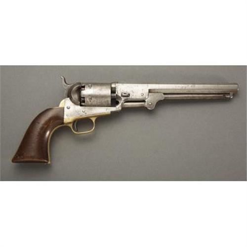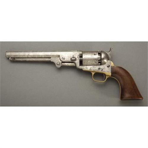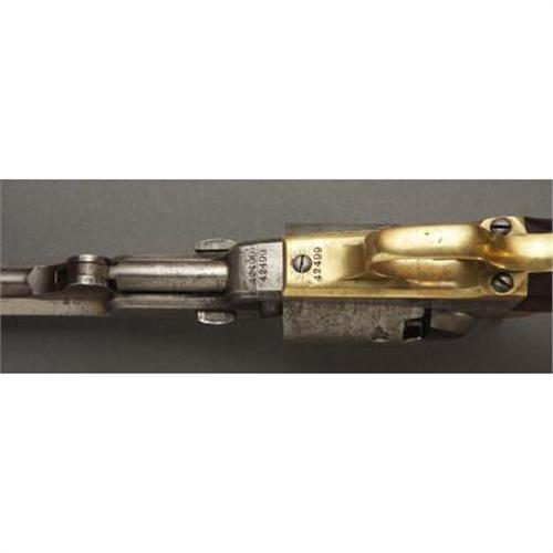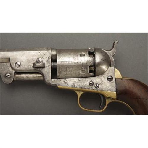 <B>VERY NICE MARTIALLY MARKED COLT M1851 .36 CALIBER PERCUSSION NAVY REVOLVER.</B></I> Serial #42499 all matching including wedge. New York City address. A very nice tight crisp martially marked M1851 Navy.<BR><B><BR>Condition:</B></I> All metal smooth bright and clean, very nice. A few scattered tiny dings, really negligible. Cylinder retains 95% of the original naval engagement scene, nice crisp markings. Brass straps excellent, all screw heads sharp. Excellent bore, mechanically perfect. U.S. on frame a bit weak but present. Grips excellent, retaining much of the original and strong inspector’s cartouches on both sides. Various inspectors’ initials also on straps and barrel. <BR><BR><b>Shipping:</b> Requires 3rd Party Shipping (<a target="_blank" href="http://www.heritageauctions.com/common/shipping.php">view shipping information</a>)