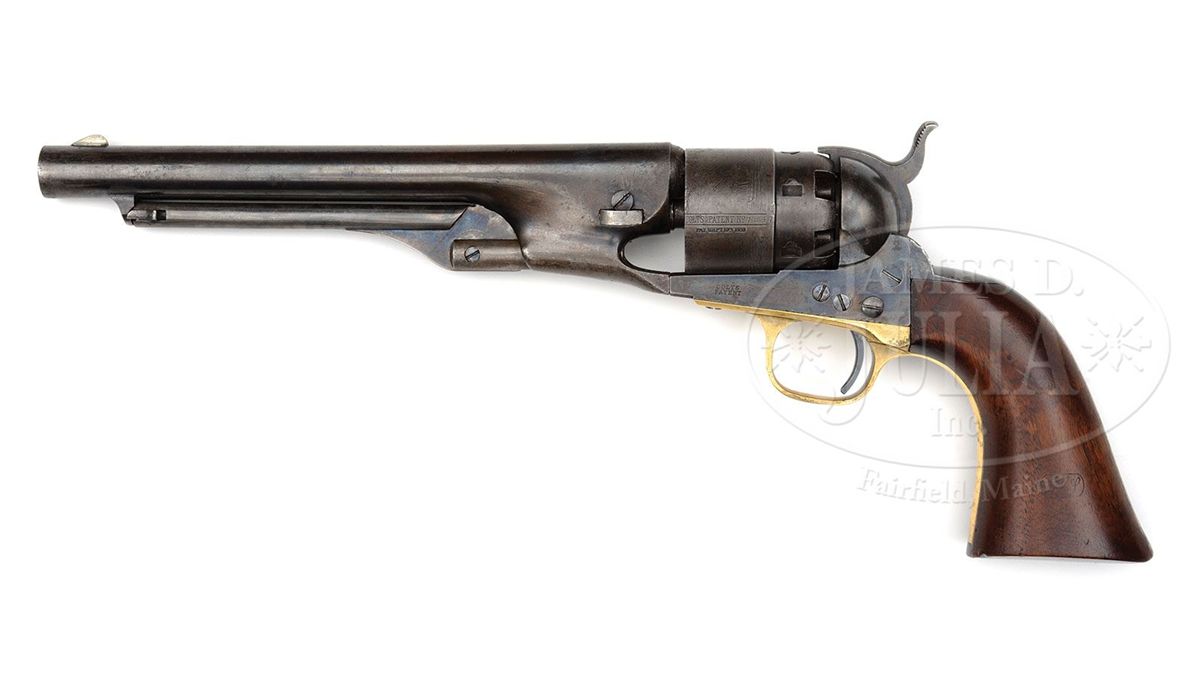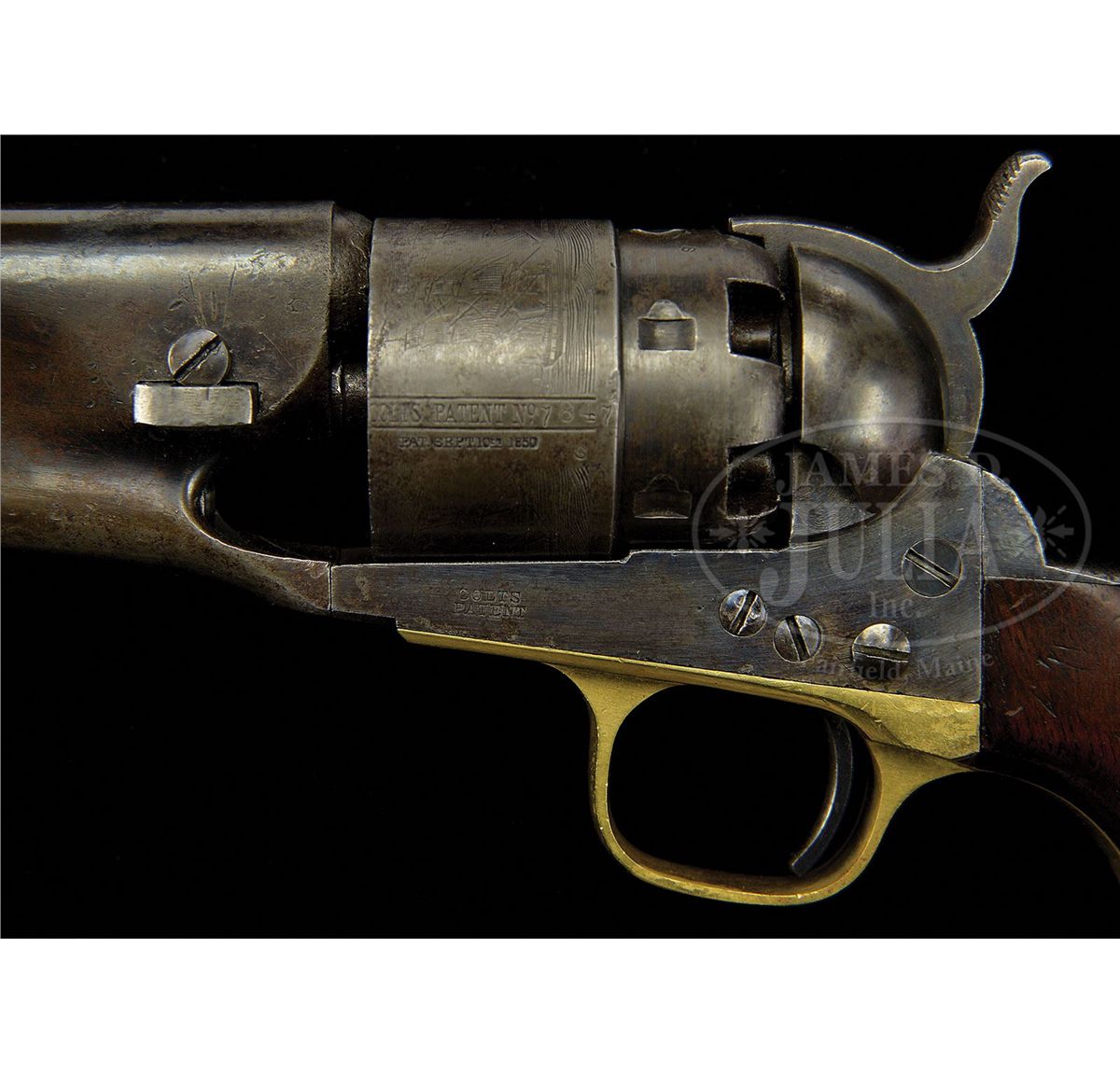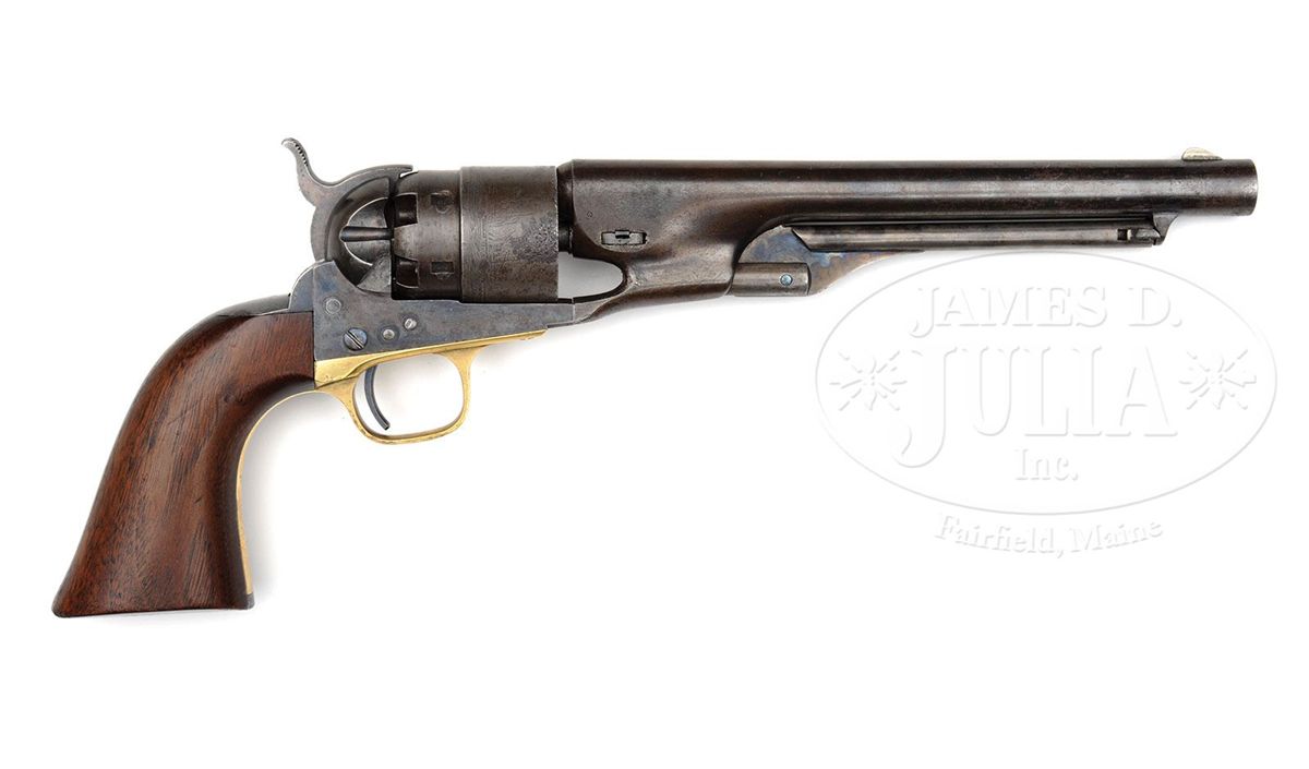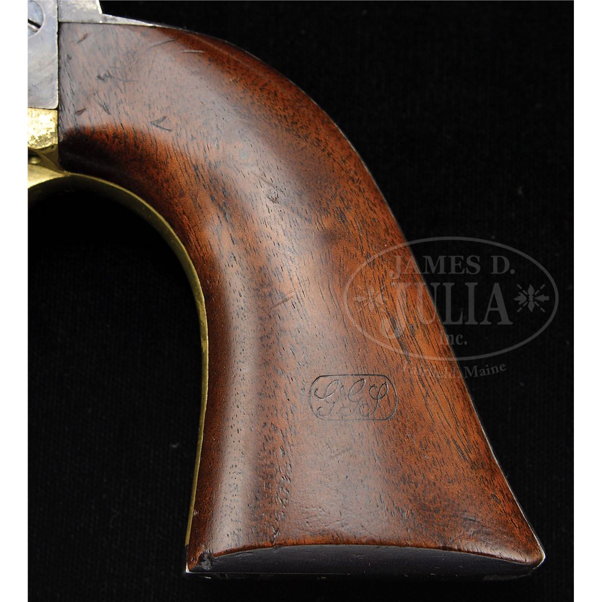 SN 7847. Cal. 44. Blue and color case hardened with 8" round barrel German silver front sight and New-York U.S. America address. The 4-screw frame, with flat head hammer screw and short stock screws, is marked "COLTS PATENT" on left side. Cylinder is usual 6 shots with Ormsby naval battle scene roll marking. The brass trigger guard and blued steel backstrap contain a one piece walnut grip with matching S/N in the backstrap channel. The left side of the grip has legible cartouche that appears to be "GGJ" or "GGL". Various other parts are marked with small inspector initials. Although Models 1860 Army were produced in fairly large numbers they're rarely found with high original finish today as most of them saw hard service throughout the Civil War and later on the American Frontier, usually under harsh circumstances with little or no maintenance. To find one today with strong original finish is, indeed, a great rarity. CONDITION: Very fine plus, all matching, including wedge and grip. Bbl retains about 90% plummy blue/brown patina with a few scattered spots of pitting around the muzzle. Rammer pivot retains bright case colors. Sides of the frame and hammer retain strong case colors with the recoil shields and top edge of hammer fading to silver. Cylinder retains traces of blue in the rebated area with the balance a medium brown patina and shows 80-85% Ormsby Naval battle scene roll marking with one spot of heavy pitting. 5 of the 6 safety pins are serviceable. Trigger guard is a light mustard patina. Backstrap and buttstrap retain strong blue at the top and bottom with a main part of the backstrap a blue/gray patina. Grip is sound with a couple of small dings in the edges and overall retains a wonderful hand worn patina. Mechanics are fine, strong bore with moderate pitting. 4-49010 JR36