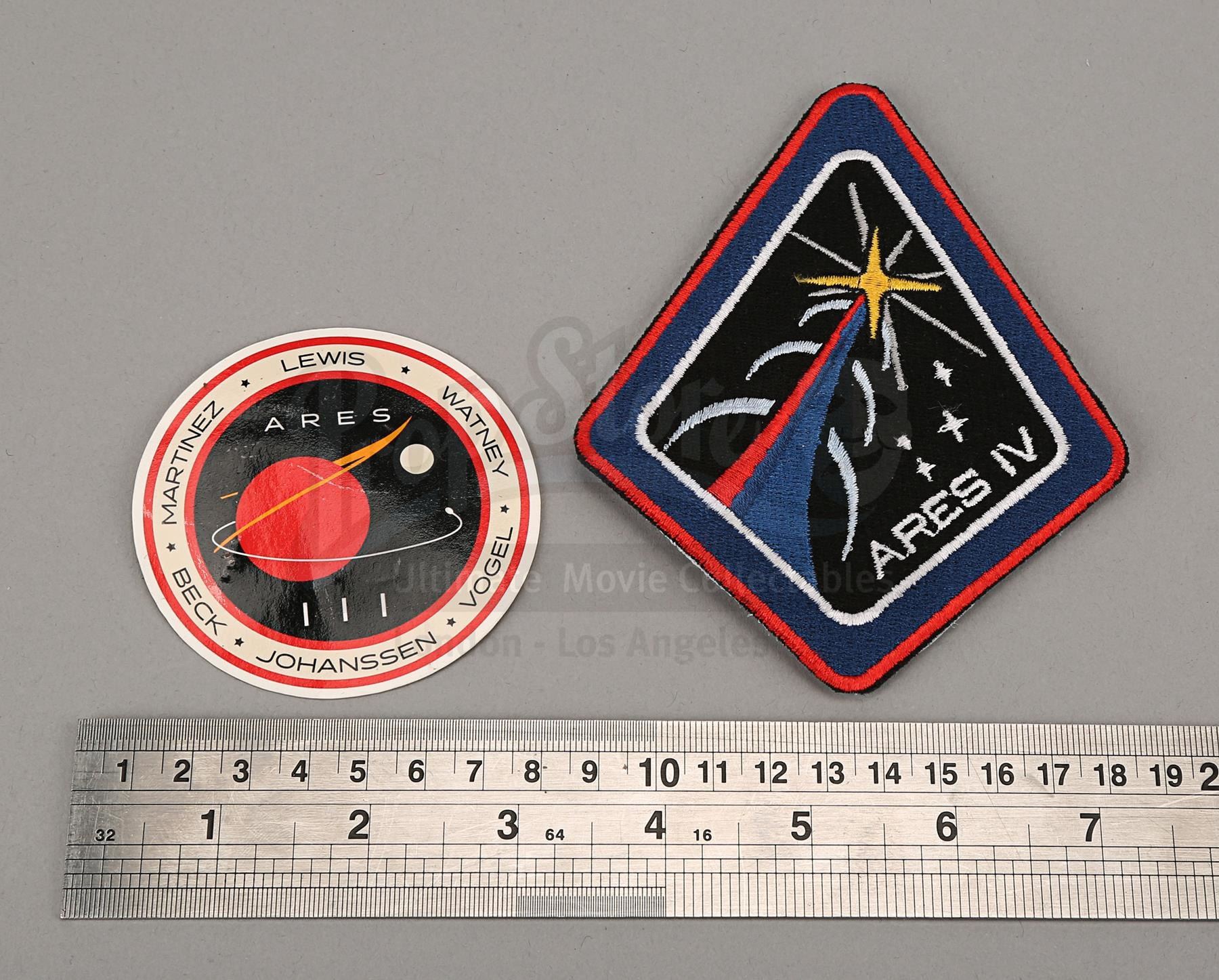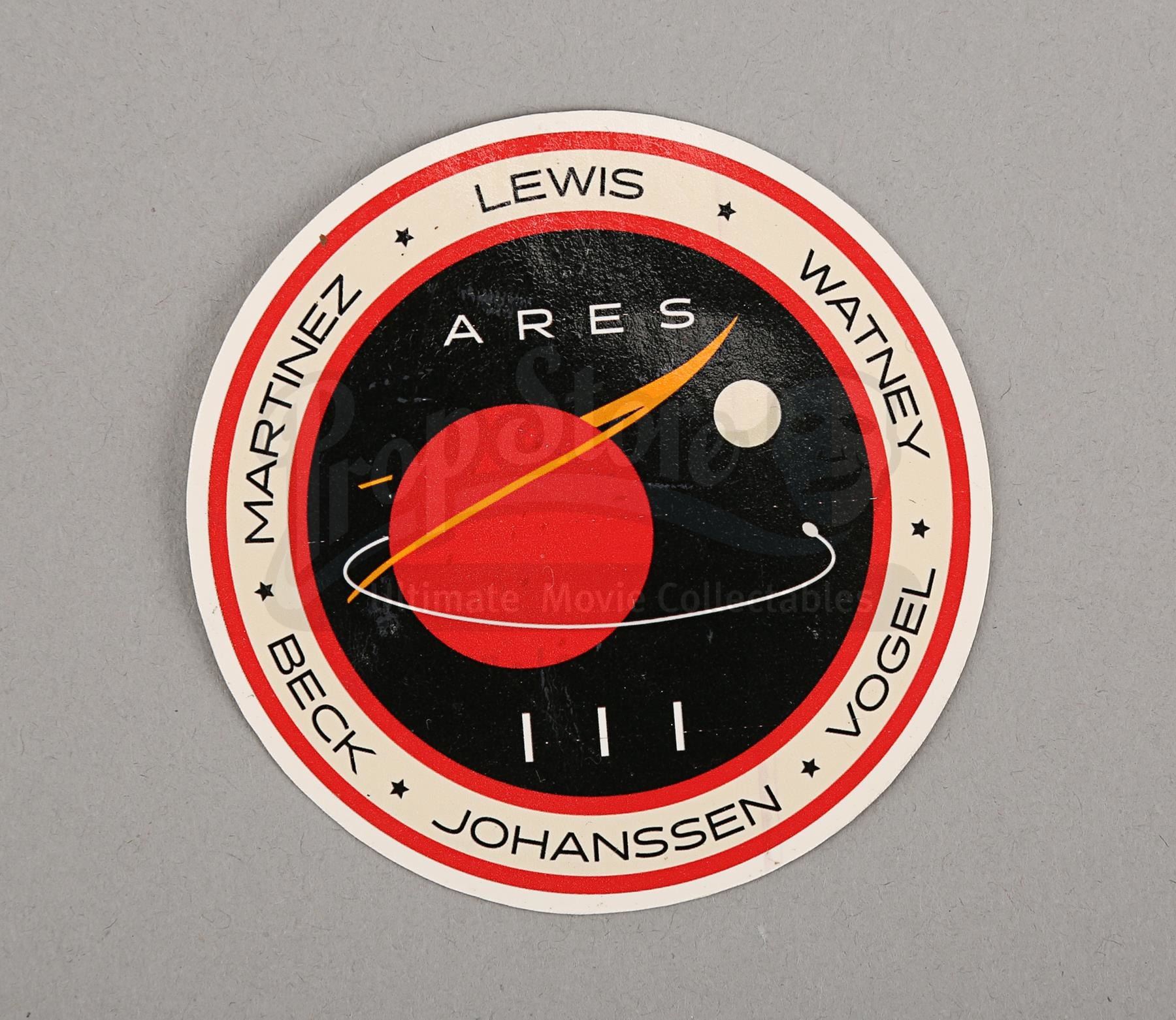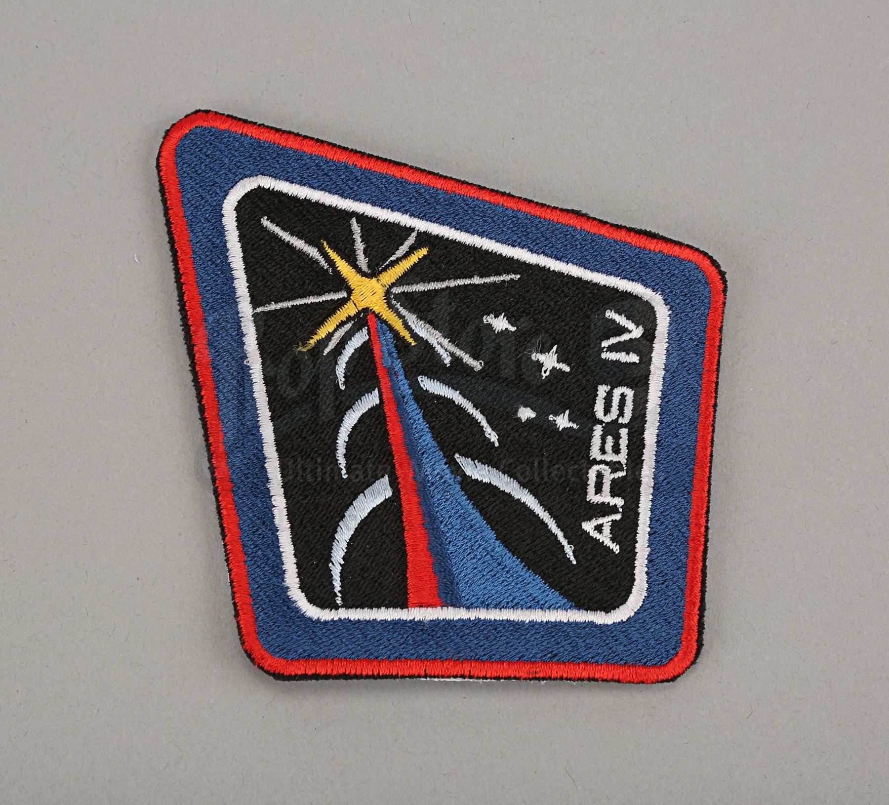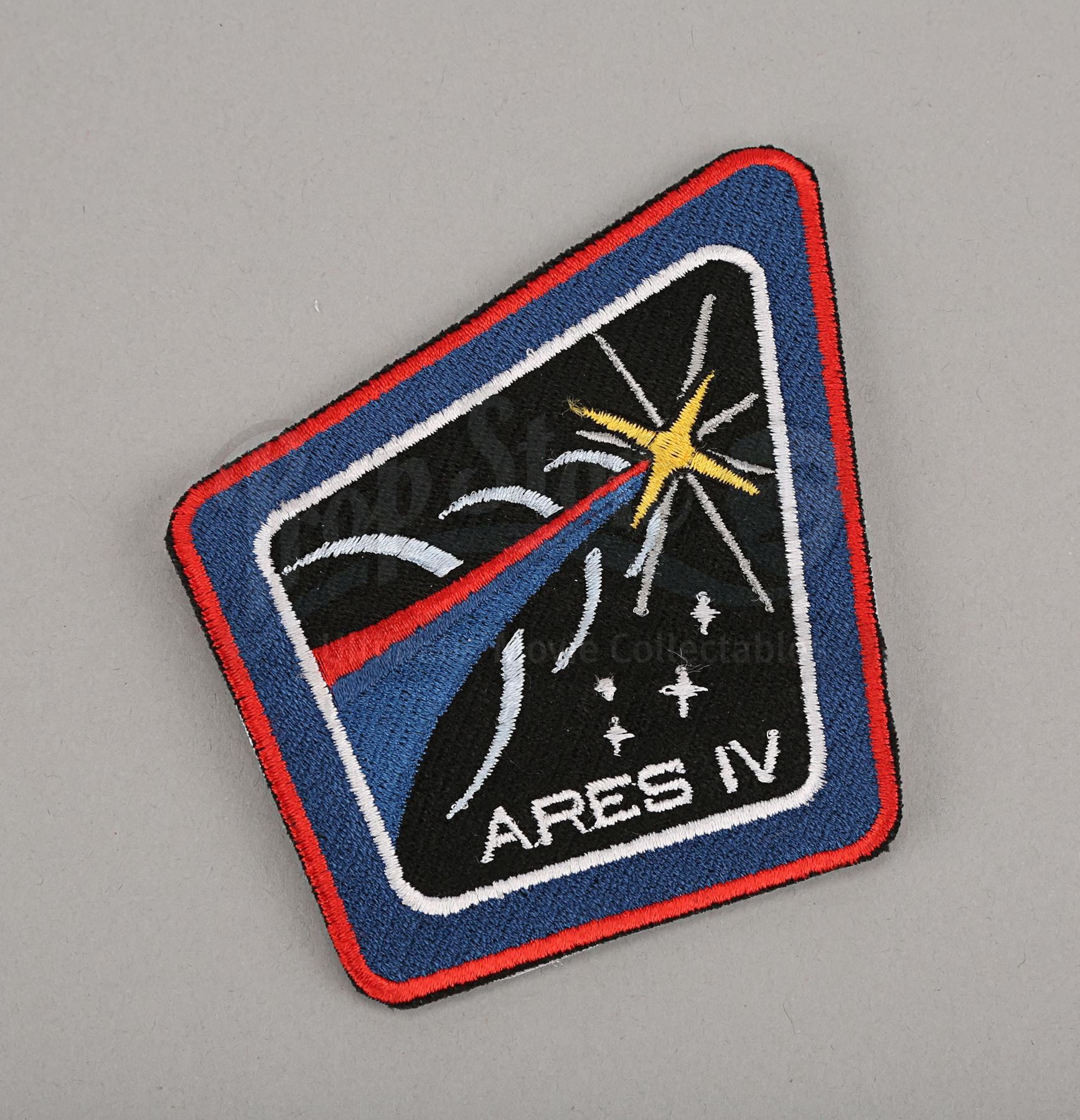 Mark Watney's (Matt Damon) "Iron Man" cut glove and Ares IV mission patch and decal from Ridley Scott's sci-fi film The Martian. Watney cut his pressure-suit glove to go "Iron Man" and propel himself to Melissa Lewis' (Jessica Chastain) Manned Manoeuvring Unit in space. Patches were worn by the astronauts to signify which mission they represented.