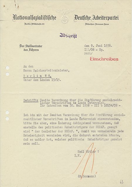 (1900 - 1945?) Head of the Nazi Party Chancellery and private secretary to Adolf Hitler, by the end of World War II Bormann had become second only to Hitler himself in terms of real political power. T.L.S. in indelible pencil on NSDAP letterhead, a signed carbon, 1p. large 4to., June 9, 1938 to Labor Minister Franz Seldte. Bormann writes concerning impending social law changes in Austria and makes references to gauleiters and political territories. Files holes, a paperclip stain at top, else very good.