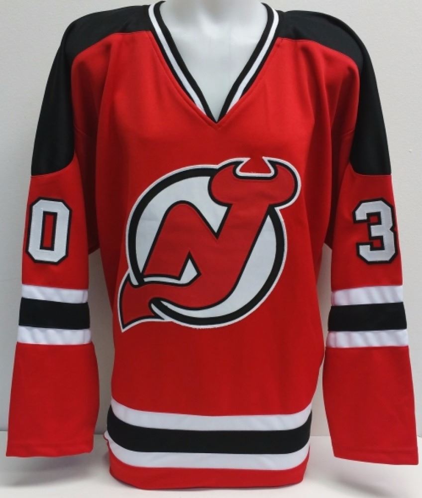 Custom on-ice style jersey. Everything sewn on. The jersey has been hand-signed in black felt-tip pen by Martin Brodeur.