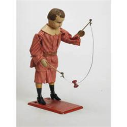 Lot # 752 MARTIN DIABALO. A hard to find French Martin boy with two sticks, alternately raising one and lowering the other while trying to balance the spool on a piece of string, connecting the two sticks. SIZE: 7-1/2" t. CONDITION: The toy has had restoration to the paint on the head and the clothing might be replaced. 1-29282 (500-700)
