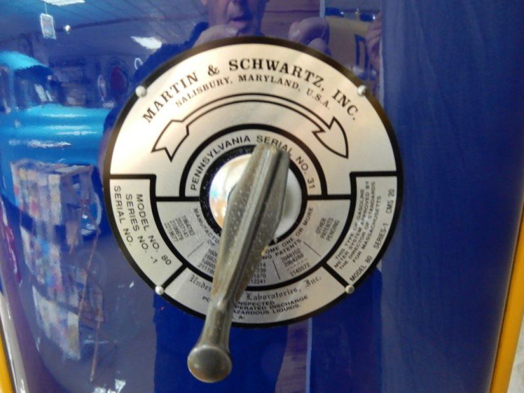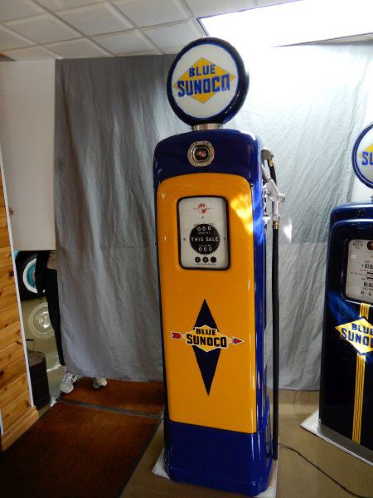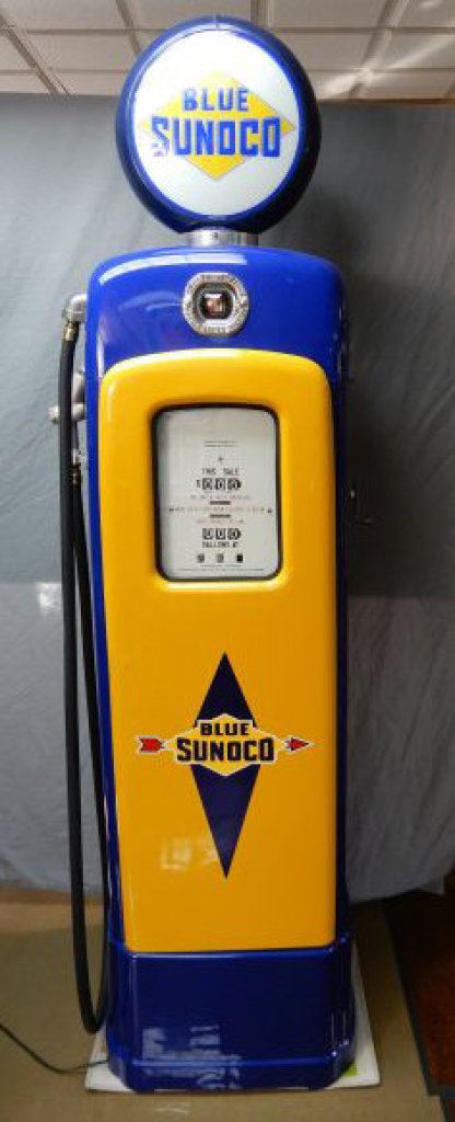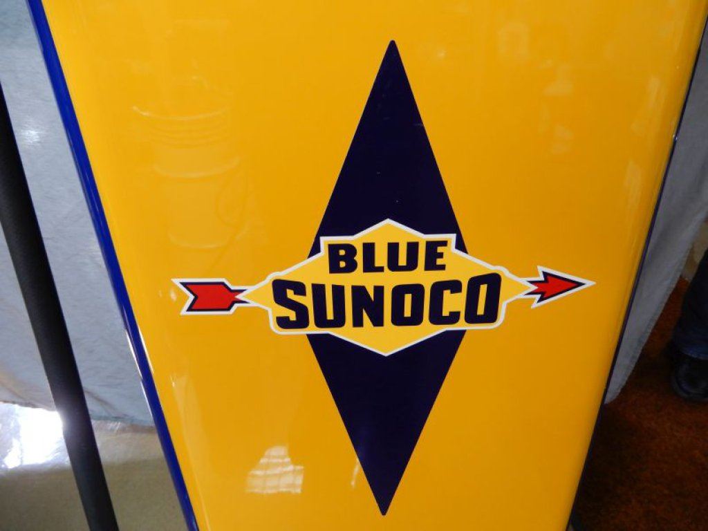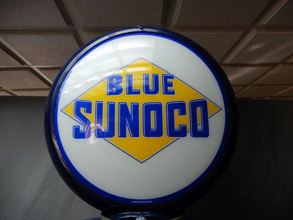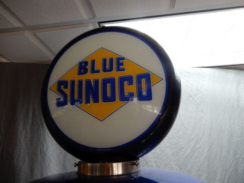 MARTIN & SCHWARTZ GAS PUMP PROFESSIONALLY RESTORED TO BLUE SUNOCO - PLASTIC BODY GLOBE - REPRO LENSES - LIGHTS UP LOCATION: LOWER LEFT
