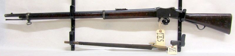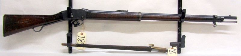 ANTIQUE, SINGLE SHOT, .577-450 MARTINI-HENRY, 33 INCH BARREL, SN 660. WOOD IS WORN AND DENTED, CHIP BEHIND RECEIVER. BLUEING IS WORN, WITH PITTED PATCHES. BORE IS DARK AND PITTED, WITH STRONG RIFLING. COMES WITH BAYONET, SCABBARD IS IN POOR CONDITION.