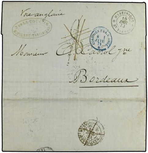 1873 BRITISH POST OFFICE. Stampless envelope to Bordeaux cancelled by ST PIERRE MARTINIQUE double ring, endorsed "Voi Anglaise" with BRITISH POST OFFICE MARTINIQUE on reverse erased by FRENCH POST OFFICE cancel, French entry cachet in blue and taxed "8" on arrival also erased as mail was sent direct by French paquebot and not via England. Unusual item of mail from the French West Indies.