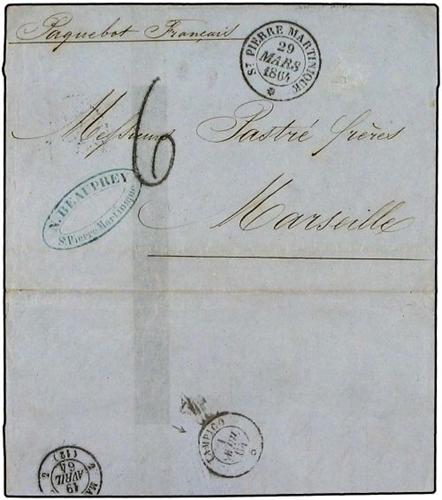 1864 (March 29) Cover to Marseille bearing superb strike of ST PIERRE-MARTINIQUE cds of despatch in black, very scarce TAMPICO French cds on reverse [Salles 1313] and Marseille [April 19] arrival cds alongside. Scarce cover, displays well.
