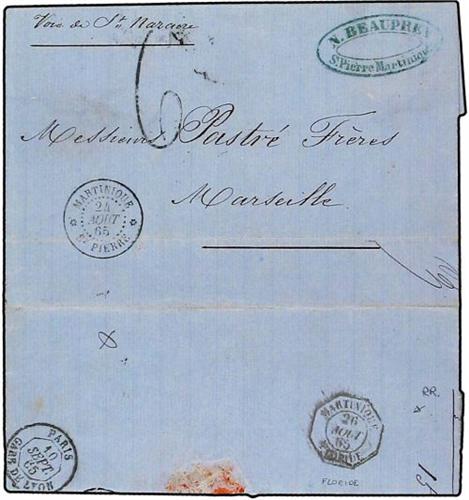 1865 (Aug 24) Entire letter to Marseille bearing fine ´Martinique-St.Pierre´ cds of despatch on front and good strike of scarce octagonal ´MARTINIQUE-FLORIDE´ Paquebot datestamp displaying well on flap, Salles 1323. A very scarce and fine cover.