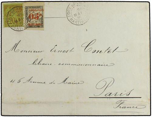 1891 Envelope to France bearing French General Colonies 20 cent yellow/green (Yvert 52) mixed with Martinique 05 on 10 cent black (Yvert 23) tied by FORT DE FRANCE double ring with PARIS arrival on reverse. Scarce combination.