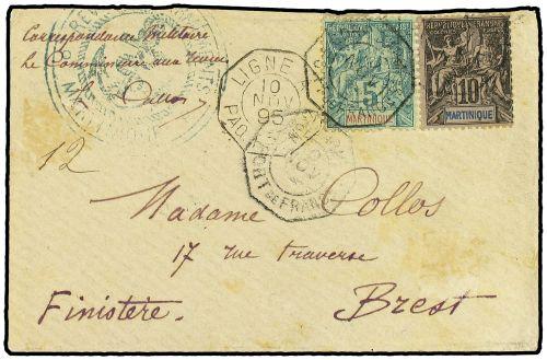 1895 Military mail envelope to France bearing 5 c green (Yvert 34) and 10 c black (Yvert 35) tied by octagonal CORRES D´ARMEES FORT DE FRANCE datestamp with military cachet and signed by the Commander sent on the French paquebot ST GERMAIN with octagonal LIGNE A PAQ. FR. Nº2 datestamp (Salles 1406) and BREST arrival on reverse. Superb item of military mail.