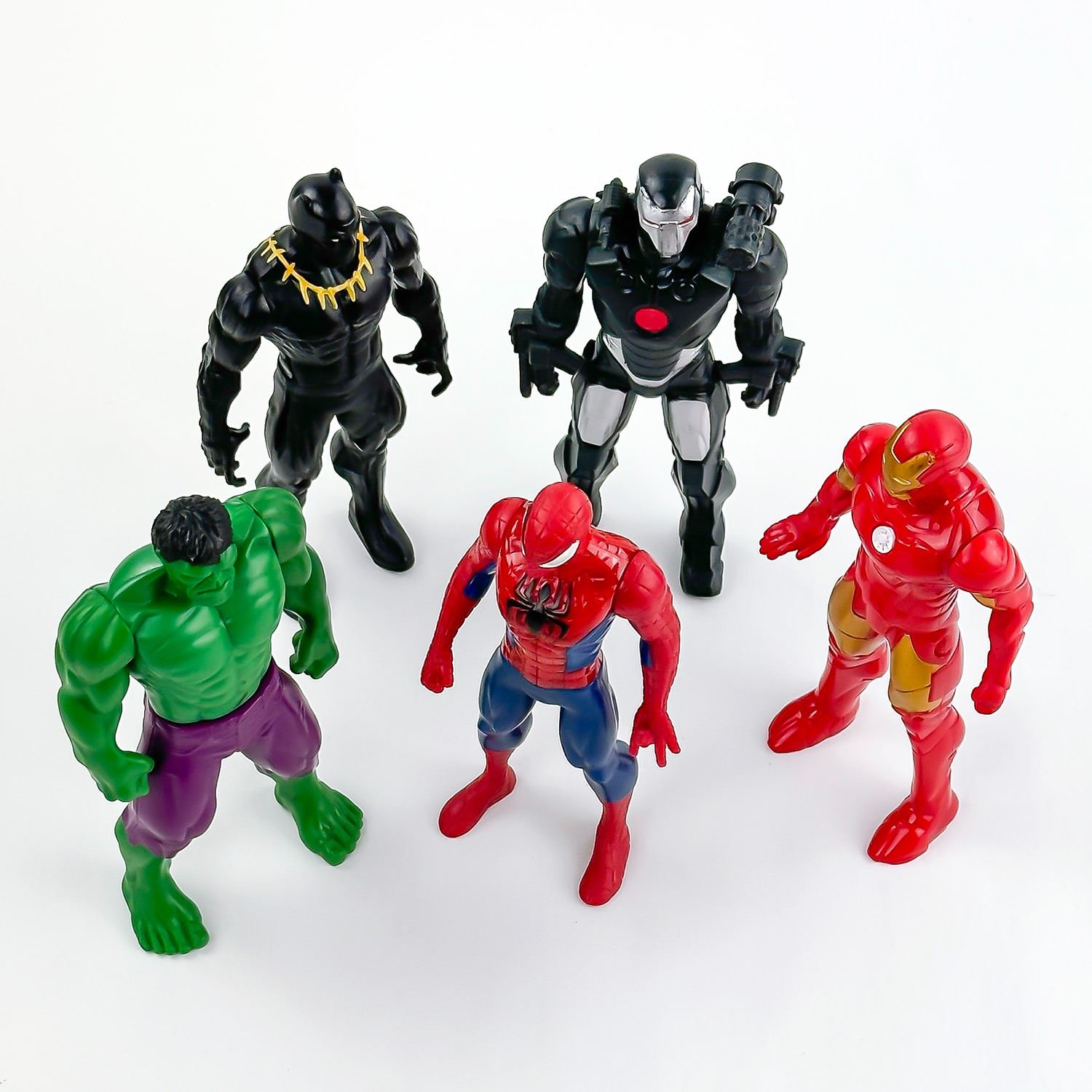 #8033 - 5 MARVEL COMIC SUPER HERO ACTION FIGURES - MARVEL - HASBRO TOYS. FIGURES ARE FROM THE 2015 MARVELS ULTIMATE PROTECTOR SERIES OF ACTION FIGURES. INCREDIBLE HULK, BLACK PANTHER, SPIDER-MAN, MARVEL’S WAR MACHINE & RON MAN. THEY MEASURE: 6” (15 CM) TALL
