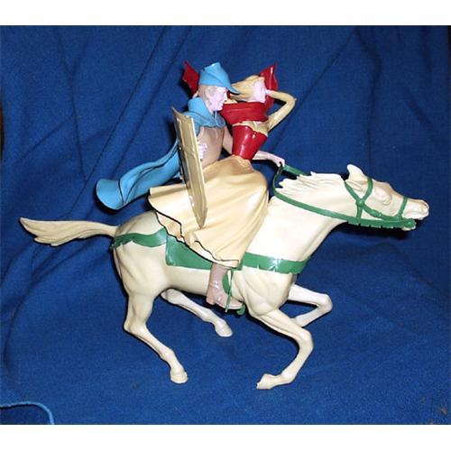 This is a rare Marx, Walt Disney Production find This set has almost all pieces. Prince Philip has lost his sword and his shield has lost the bottom portion to hold it to his arm. There are a few melt marks on Sampson from his tack, but not as bad as most of these Marx models had problems with. Aurora seems to be missing her tiara and her hand has a melt mark from Prince Philip's neck. All parts are in excellent shape with the horse tack.The horse measure 7 in. in ht. x 14 in. (nose to tail). the prince is 6 1/2 in with hat. the princess is 6 in. This is in very good condition for the age, and I doubt you will see another for a long while, if ever. This is the first one I have come across.