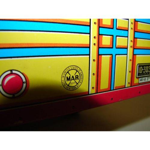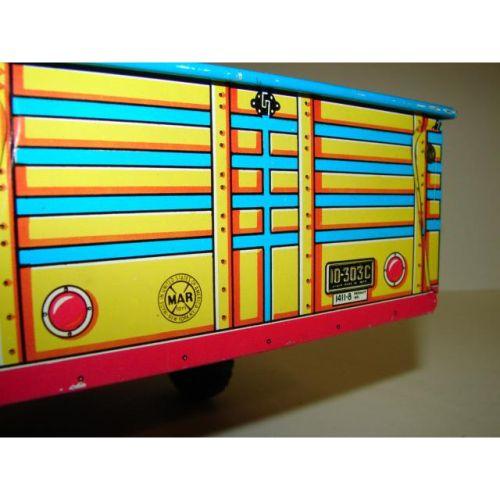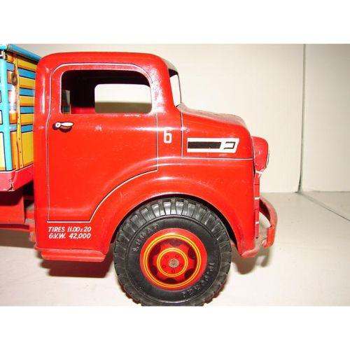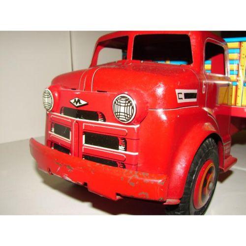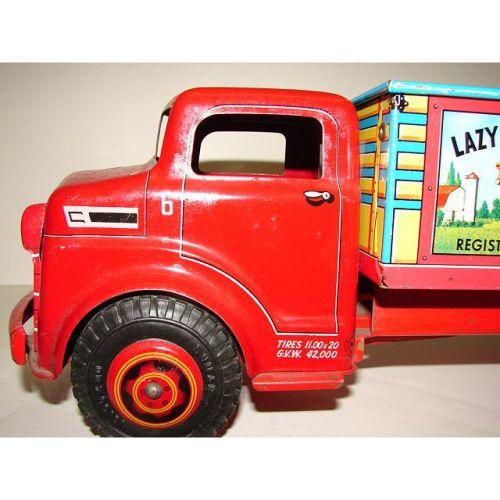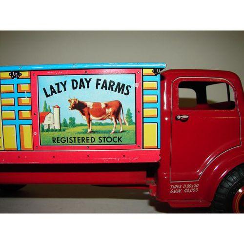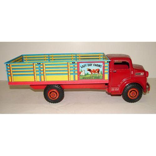 MARX LAZY DAY FARMS STAKE TRUCK. Pressed steel truck with red painted cab. Marked on back. 17.5” L