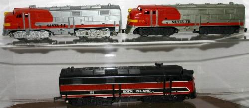 MARX ROCK ISLAND E UNIT, 2 SANTA FE E UNITS. ALL 3 ARE POWERED.