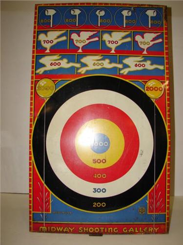 MARX TOYS TIN MIDWAY SHOOTING GALLERY TARGET. Tin target board shows surface scratching throughout and some rusting at bottom. Has cardboard backing. 16” x 27”