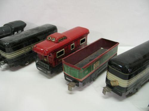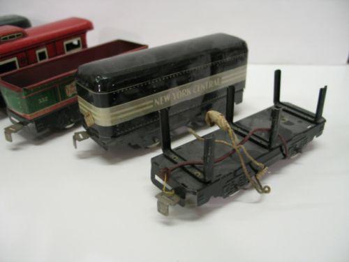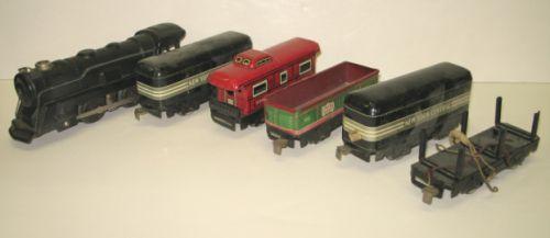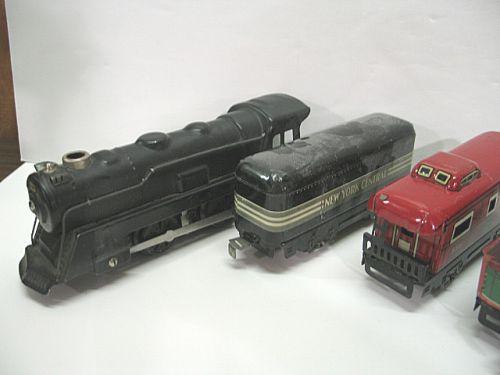 MARX TOY TRAIN SET. Consists of engine, Rock Island car #522, New York Central Line Caboose #556, two New York Central cars, & one log cart, track, and 50 watt transformer.