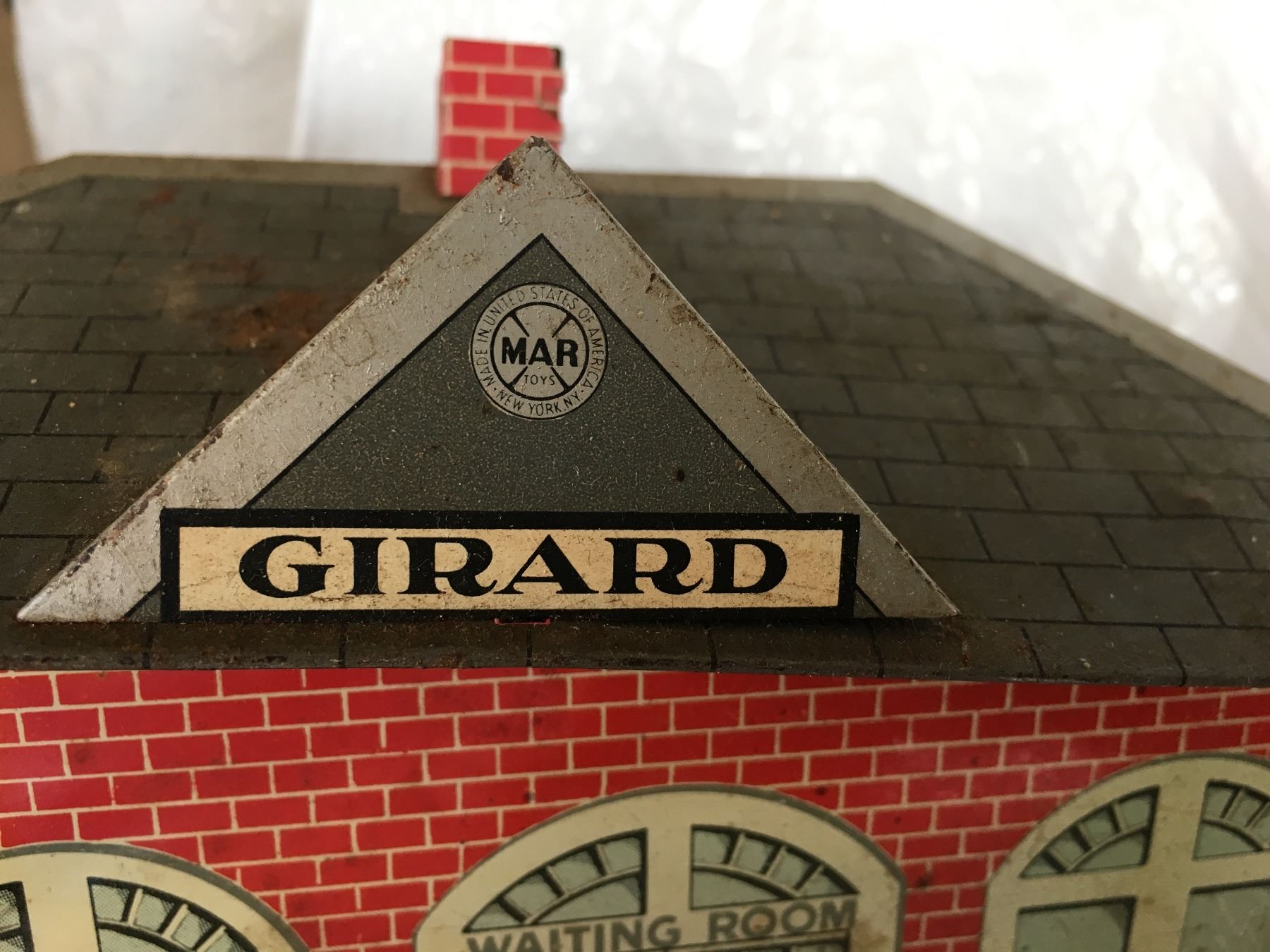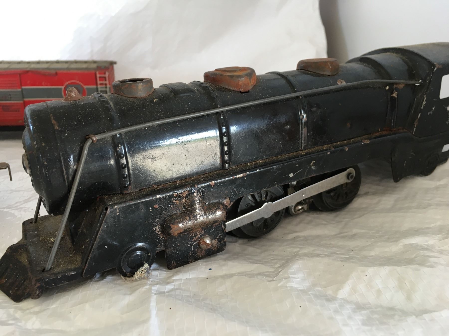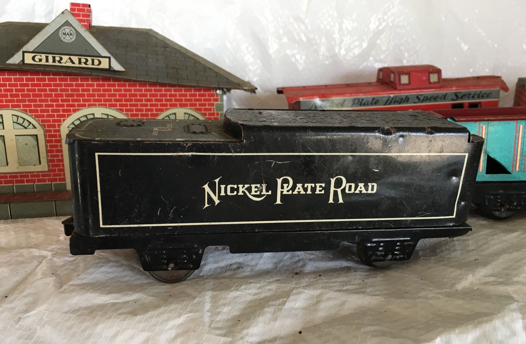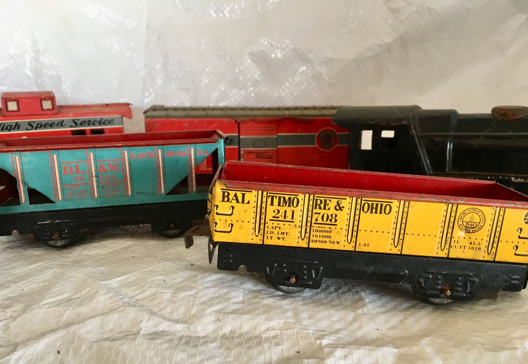 TOY TRAIN SET, 5 TIN CARS, FEATURING BALTIMORE, LACKAWANNA AND TRAIN STATION