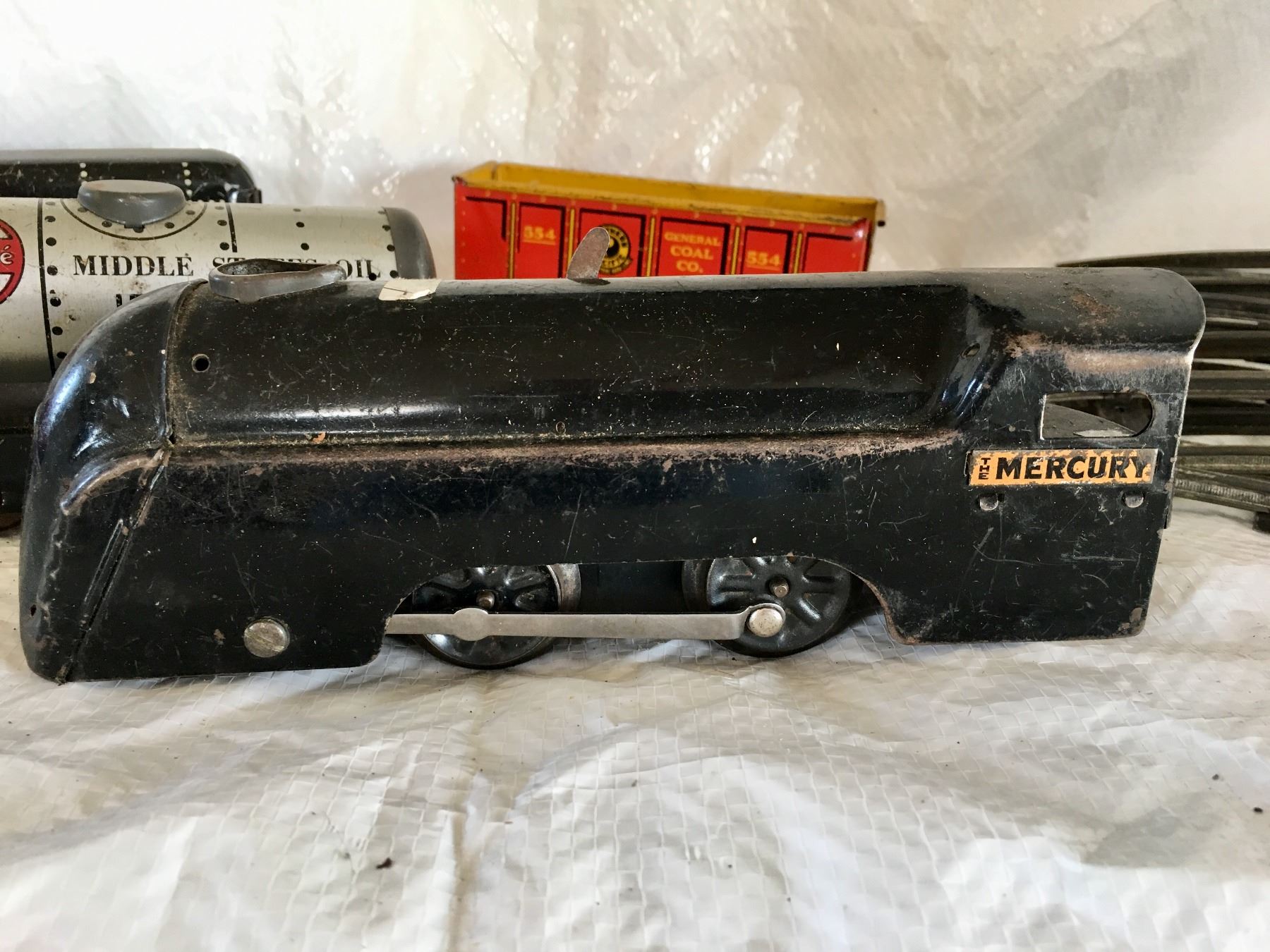 TOY TRAIN SET, 5 CARS, TRACK, FEATURES THE MERCURY ENGINE. CONDITION: G