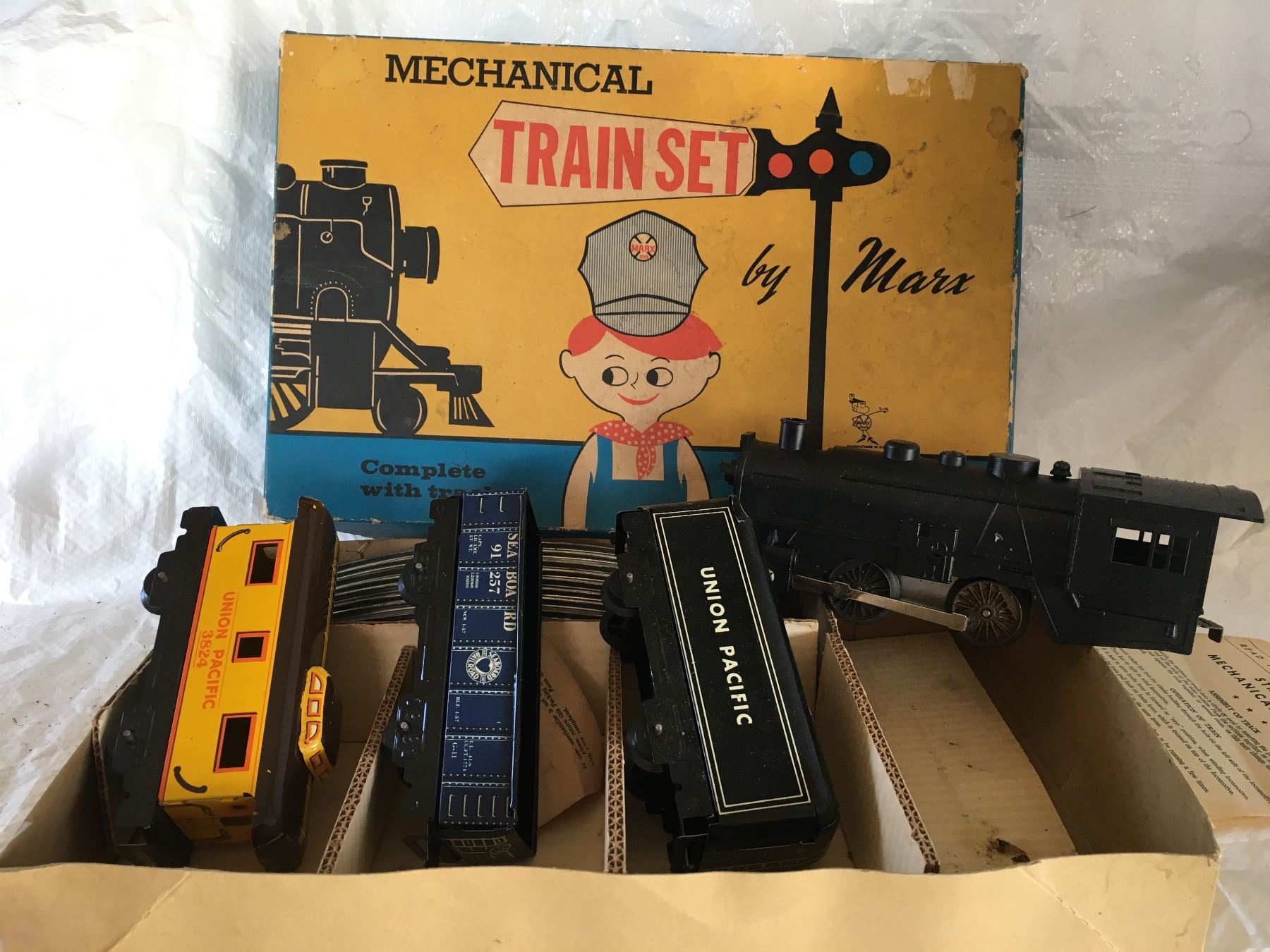 MECHANICAL TRAIN SET W/ ORIGINAL BOX, AS NEW. 4 UNION PACIFIC CARS, TRACK. CONDITION: VG