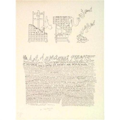 HERE'S A GREAT LITHOGRAPH TITLED "ART INVESTMENT REPORT" BY THE IMPORTANT GERMAN AMERICAN ARTIST, MARY BAUERMEISTER. ACCORDING TO GEZA PERNECZKY "IN THE 60'S SHE WORKED IN NYC, THE CENTER OF POP ART WITHOUT ADOPTING THE CONSUMER ORIENTED LANGUAGE YET EXPLOITING THE VIBRANCE AND EXCITEMENT OF THE EARLY 60'S. THIS PERSON-ALWAYS CURIOUS AND ALWAYS REVEALING- IS AN EXCEPTION AMONG ARTISTS: SHE AVOIDS THE DOGMATICALLY CLOSED FORMS AND BEHAVIORS THAT RESULT FROM A COMPETITIVE ART SYSTEM. MARY BAUMENISTER REMAINED OPEN AND DID NOT SEEK A CAREER BASED UPON A STYLE." <P>