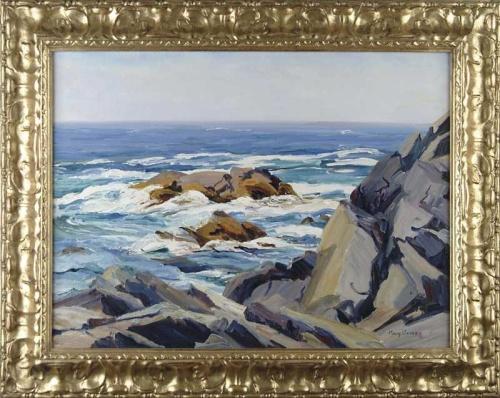 MARY CABLE BUTLER (American, 1865-1946) OFF THE COAST-MONHEGAN, MAINE. Outstanding oil on canvas seascape with blue ocean having white cresting waves lapping on rocks and foreground with coastal rock ledges. Signed lower right "Mary Butler". Housed in an outstanding gilt carved wood replacement modern frame. SIZE: 24" x 32". CONDITION: Very good. Cleaned with only very minor spot inpainting. Relined, restretched. 9-27959