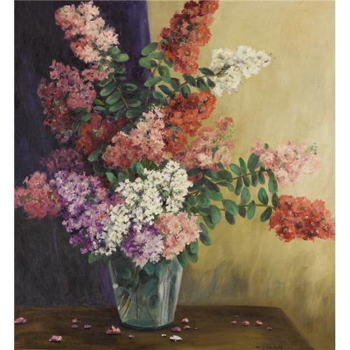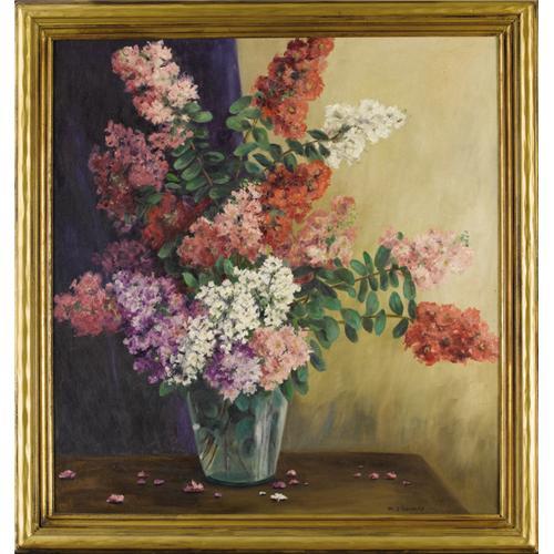 <B>MARY EDWARDS (1871-1951)</B></I><BR><I>Still Life with Crepe Myrtle,</B></I> 1940<BR>Oil on canvas<BR>32in. x 30in.<BR>Signed lower right<BR><BR>Provenance:<BR>Acquired from the artist by Myra Bruce, Collinsville, Texas<BR>By descent to Dorothy Davis<BR>Purchased from the above by the present owner<BR><BR> <B>Condition Report:</B> Excellent condition. Period frame in excellent condition.<BR><BR><b>Shipping:</b> Requires 3rd Party Shipping (<a target="_blank" href="http://www.heritageauctions.com/common/shipping.php">view shipping information</a>)