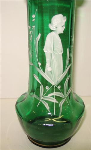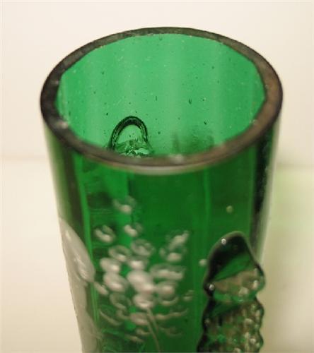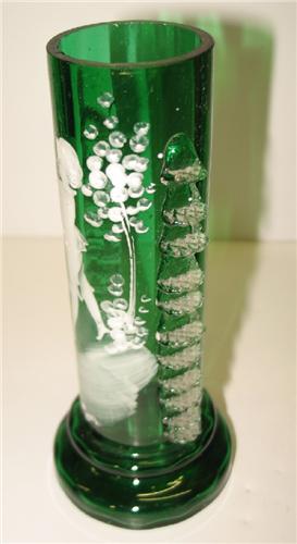 2 PIECE LOT OF GREEN MARY GREGORY GLASS. Consists of one fluted top vase decorated with female (8.5” H). Loss to gilt line decoration at top and bottom. Also consists of one small vase decorated with young male and containing two applied clear glass decoration (6” H). Roughness to top edge.