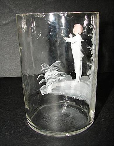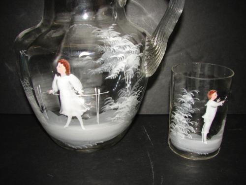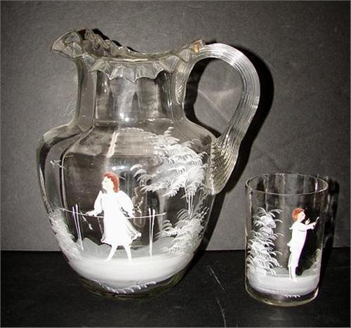 CLEAR MARY GREGORY GLASS PITCHER AND CUP. Pitcher is decorated with hand painted scene of female and trees. Pitcher has a ruffled top and an applied ribbed clear glass handle. 9” H. Cup is decorated with hand painted scene of male and trees. Cup shows some chipping along outer rim. 4” H