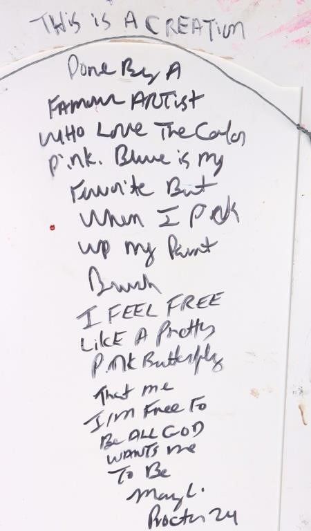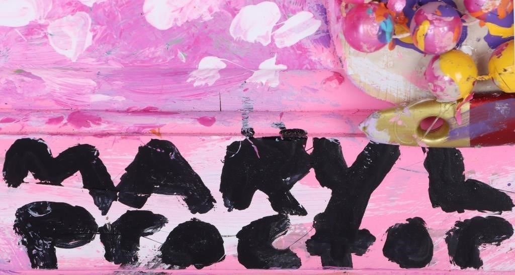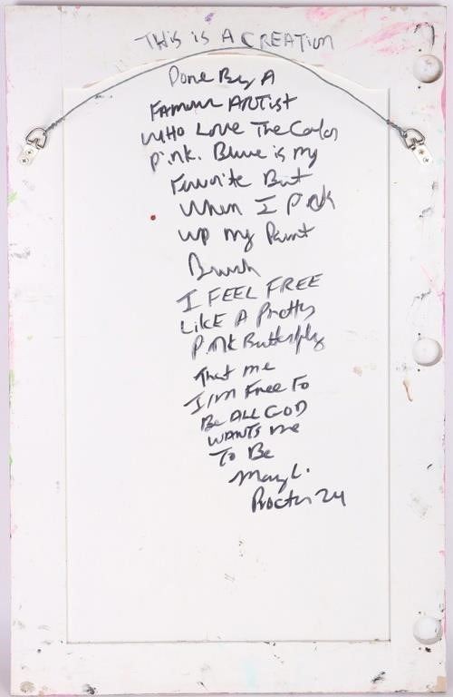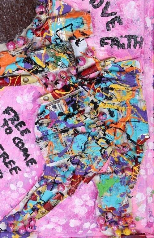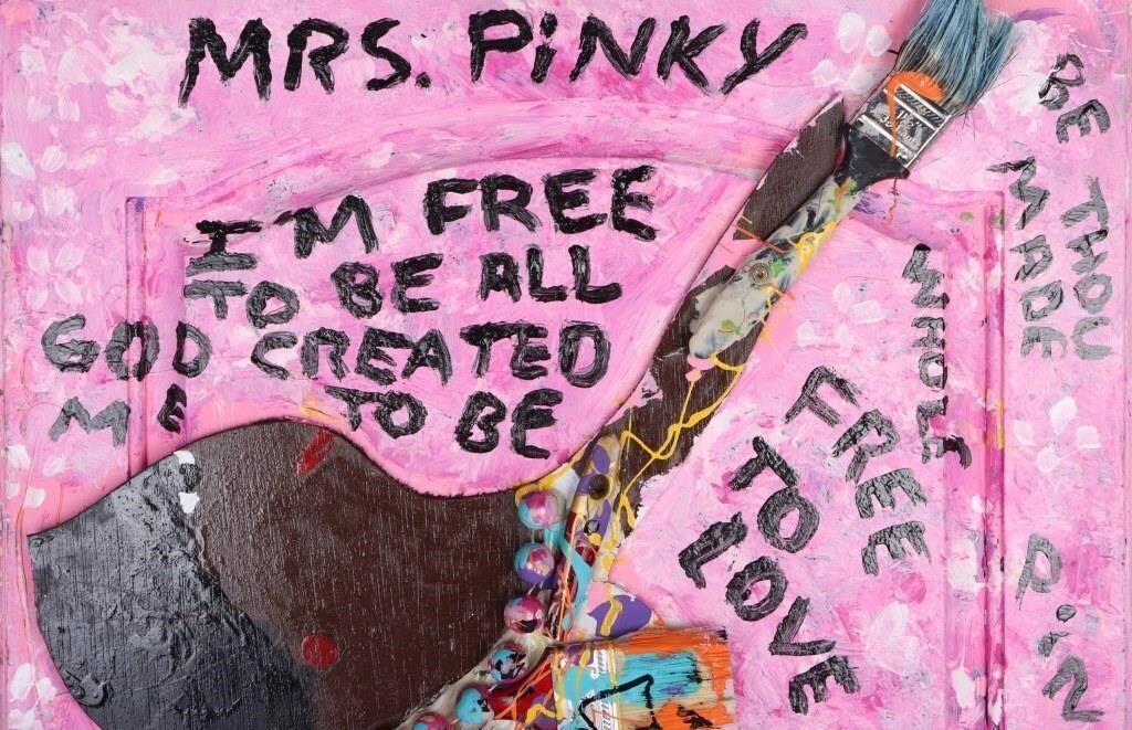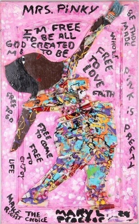 Mary Louise Proctor (American, 1960-Present) "Mrs. Pinky" oil on door collage depicting a women with an outfit made out of various paint brushes and beads. This artwork is an expression of Mary L. Proctor's love for the color pink. Born in Lloyd Florida in Jefferson County, "Missionary" Mary L. Proctor (born 1960) is an American artist, best known for her visionary paintings, collages, and assemblages.