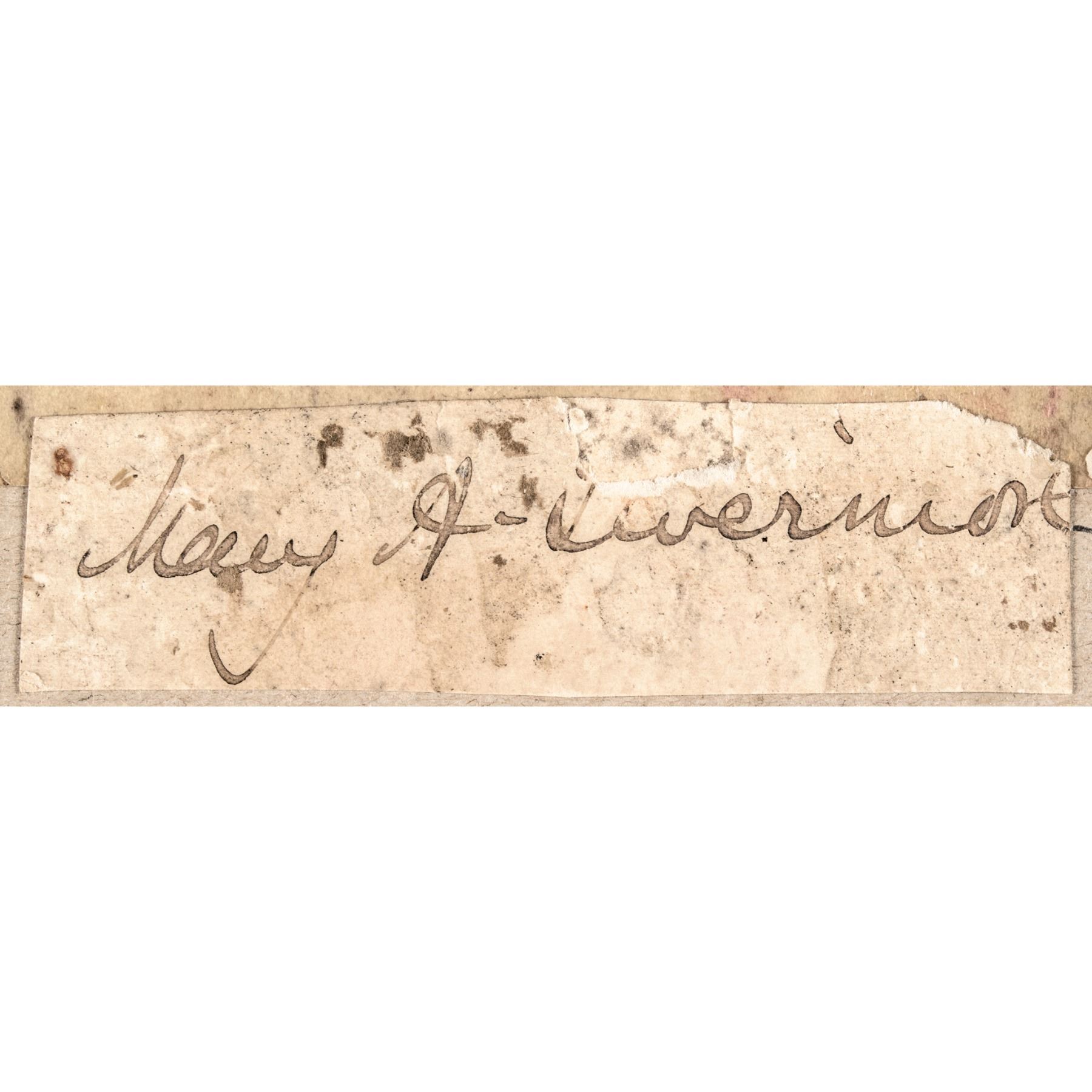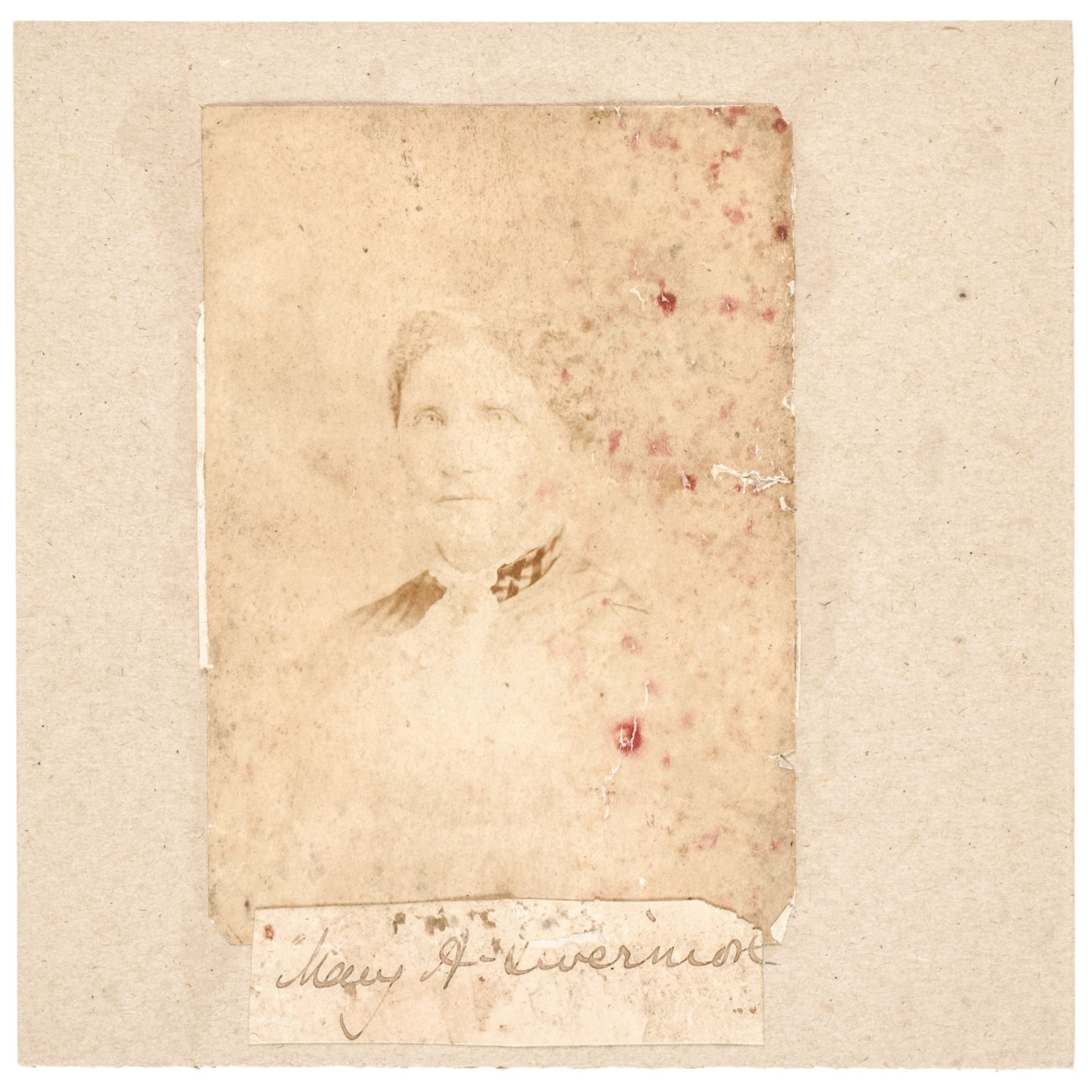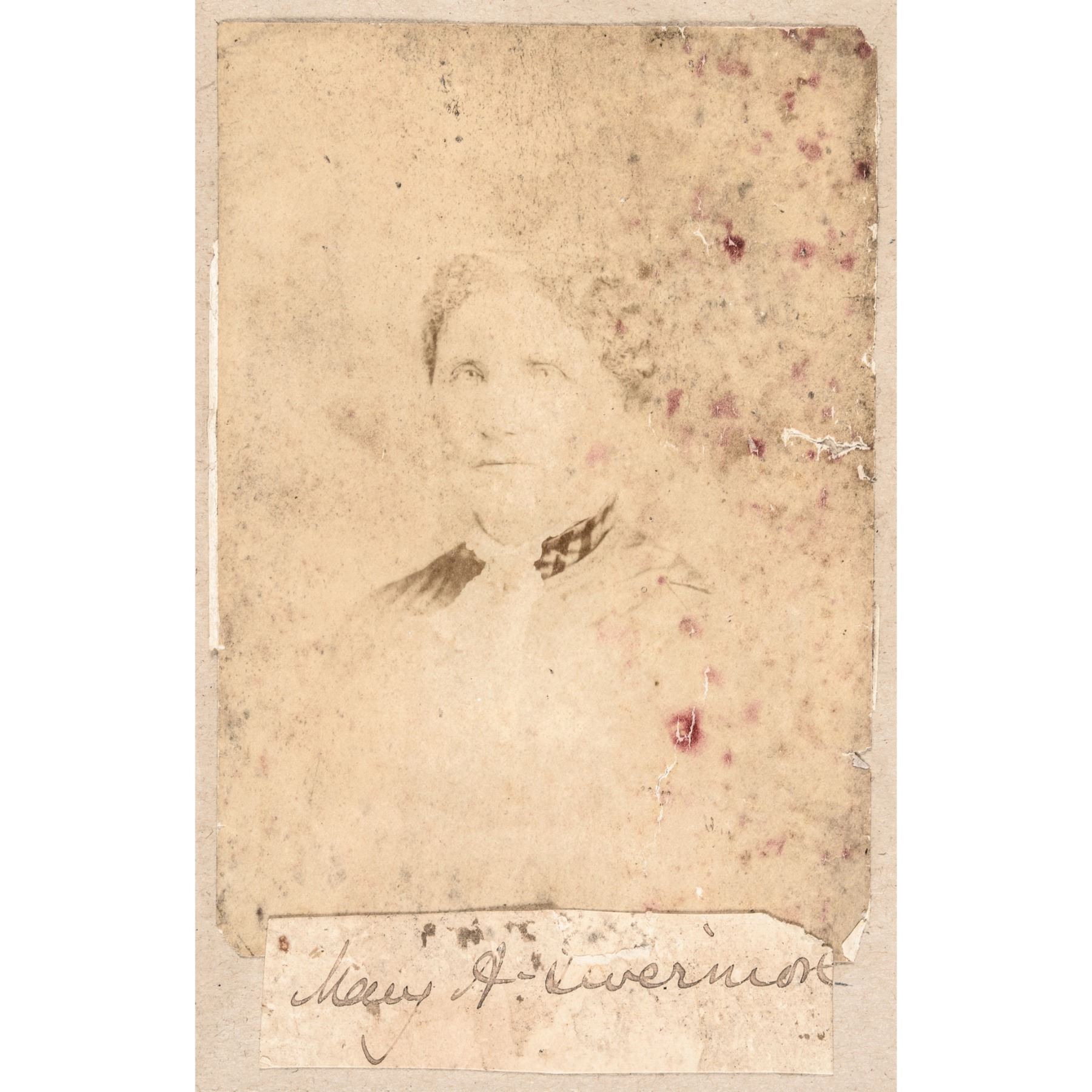 An original Photograph of Mary A Livermore (in very poor quality with wear and stains). With an original Large Clip of her actual Signature “Mary Livermore” on paper in brown ink, laid down beneath the photograph.