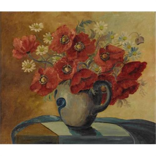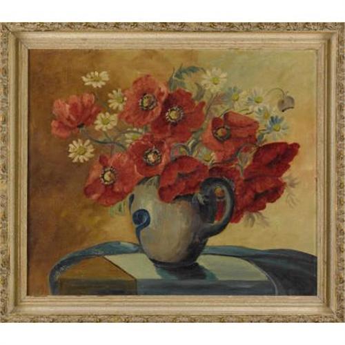 <B>MARY MOTZ WILLS (1875-1961)</B></I><BR>Untitled Floral Still Life<BR>Oil on canvas<BR>19-1/2 x 23 inches (49.5 x 58.4 cm)<BR>Signed lower left<BR><BR> Mary Motz Wills grew up in Waco, Texas. She studied art in Boston, Philadelphia, and New York at the Art Students League. The artistic fame of Wills rests on the prodigious number of scientific renderings of wildflowers, particularly of Texas, that she painted. The University of Texas Press published a book titled, <I>Roadside Flowers of Texas,</B></I> in which 257 of her botanical paintings were reproduced. The Witte Museum has a large collection of her work and she is prominently included in the book, <I>Art for History's Sake: The Texas Collection of the Witte Museum.</B></I><BR><BR>The two Mary Motz Wills paintings in this auction came from the Philadelphia area and may have been painted while she was taking classes there.<B>Condition Report:</B> Good original condition. Minor losses to an approximately three-square inch area to the left of the vase. Period frame in excellent condition.<BR><BR><b>Shipping:</b> Requires 3rd Party Shipping (<a target="_blank" href="http://www.heritageauctions.com/common/shipping.php">view shipping information</a>)