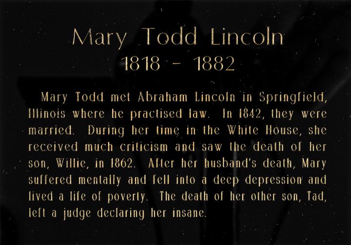 “Mary Todd met Abraham Lincoln in Springfield, Illinois where he practiced law. In 1842, they were married. During her time in the White House, she received much criticism and saw the death of her son, Willie, in 1862. After her husband’s death, Mary suffered mentally and fell into a deep depression and lived a life of poverty. The death of her other son, Tad, left a judge declaring her insane.”