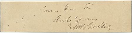 (1797 - 1851) English novelist, wife of Percy Bysshe Shelley, author of the terrifying tale Frankenstein. Rare and very desirable sentiment and signature on a 4 1/4" x 1" slip: "I am dear Sir Truly yours M W Shelley". Fine condition.