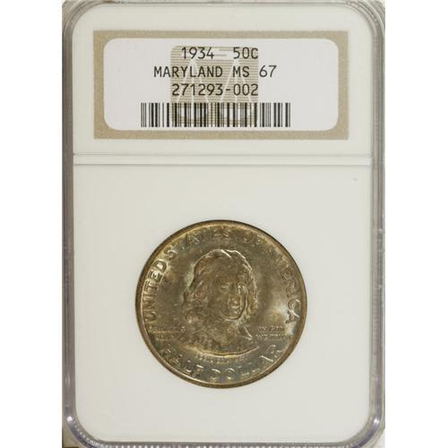 <B>1934 50C Maryland MS67 NGC.</B></I> Swirling hazel, violet, and champagne patina graces both sides of this highly lustrous Superb Gem. The portrait of Cecil Calvert, Lord Baltimore is well-defined and reflects this coin's careful preservation. NGC has graded only two MS68 pieces (4/07).<BR><I>From The Cary & Cheryl Porter Collection.</B></I><BR><BR><b>Shipping:</b> Coins & Currency (<a target="_blank" href="http://www.heritageauctions.com/common/shipping.php">view shipping information</a>)