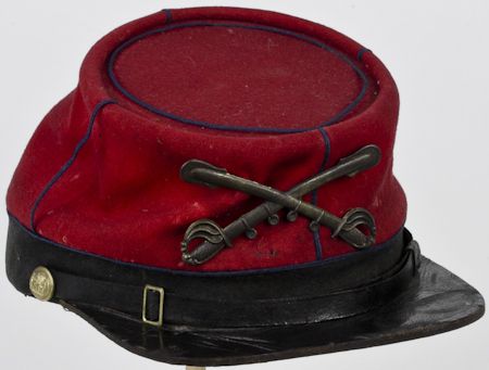 Red wool Maryland Civil War-era kepi, possibly C.S.A. militia, bearing Canfield, Bro. & Co., Baltimore imprinted makers label within, bears staff officer's buttons and reproduction cavalry insignia, 3" tall in front, about 5" tall in rear, trimmed in blue worsted cord with a 1" black band at base. Missing liner and sweatband but retains 1 1/4" cardboard stiffener, blue cord loose in places.