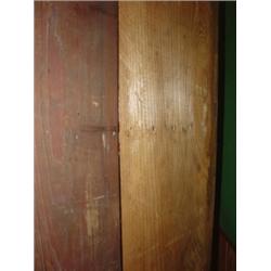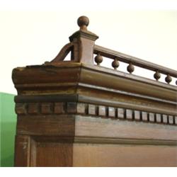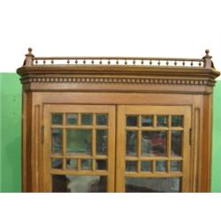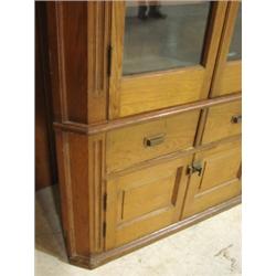 TALBOT COUNTY MARYLAND PINE CORNER CUPBOARD. Circa 1870-1880. Two doors on top. Top of doors are 11-lite. 5 shelves on top. Two drawers on bottom with two raised panel doors. Dentil molding on top with galley. Missing one ball on galley top. Original hardware. Two replaced boards on back. 100" H, 44" W, 22" Corner