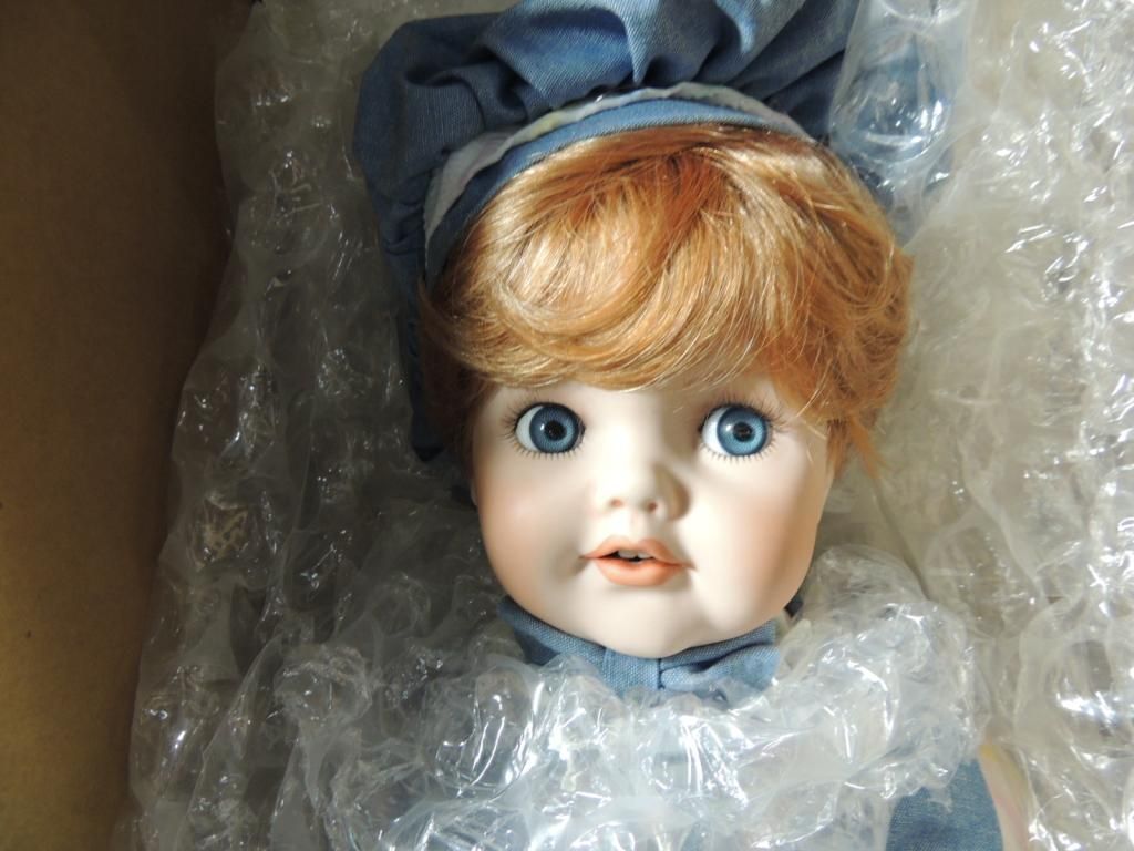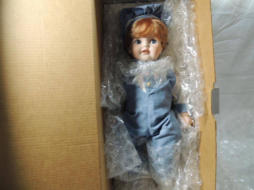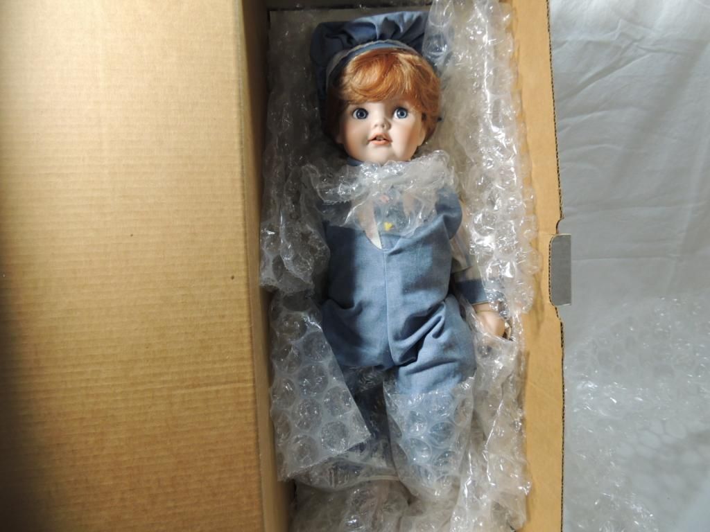 #83/500 PORCELAIN DOLL IN GOOD CONDITION. IN ORGINAL BOX. KYLE IN OVERALL OUTFIT. 22" TALL AS SHOWN SEE PHOTO FOR MORE DETAILS.