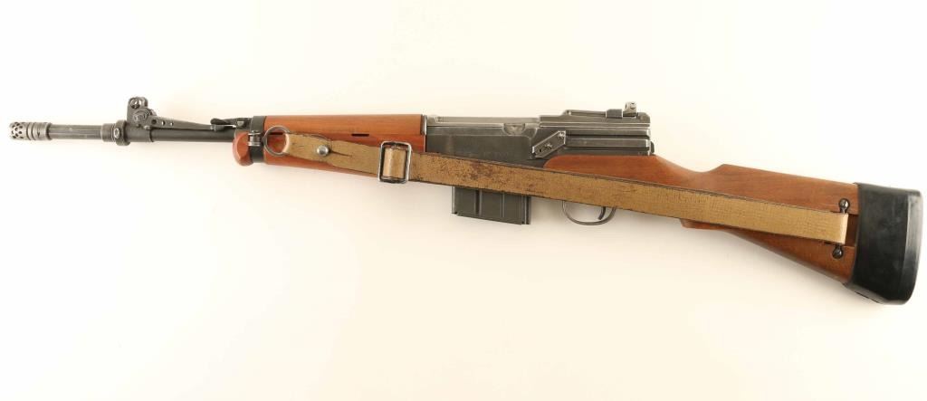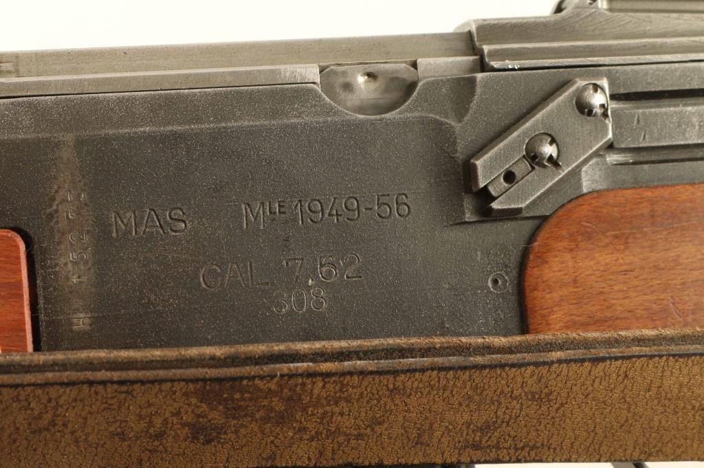 French military semiautomatic rifle chambered for 308 Winchester, imported by CAI, St Albans VT. Features approx 18 inch barrel, adjustable sights, integral grenade launcher with gas cut-off and flip up grenade sight, side mounted sling swivels, military issue slip-on rubber butt pad. Bore is very good, frosted and dark with strong rifling; may improve with cleaning. Parkerized metal finish is good or better condition; shows much thinning on flats and bare metal at sharp edges. Stock is very good condition with dents from use. Includes a serviceable French military leather sling, 3 magazines (total), accessory pouch with clamp-on flash hider with night sights. Condition is NRA Very Good ***C&R Firearm***