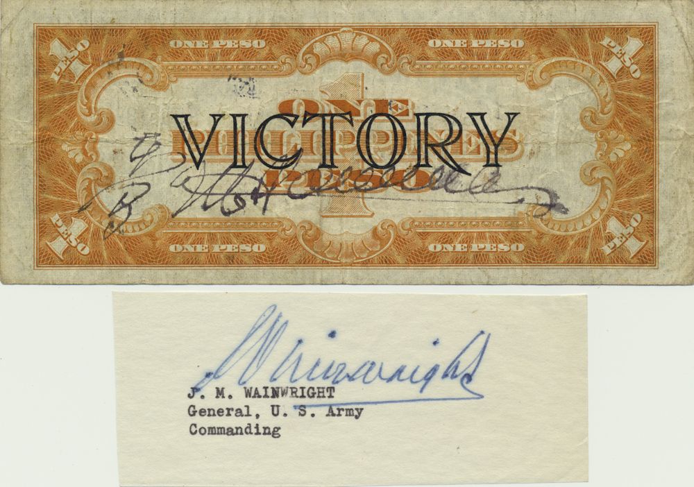 MASAHARU HOMMA (1887 - 1946) Japanese general in charge of the invasion of the Philippines and the infamous Bataan "Death March". Homma also ordered the bombing of Manila after the declaration that it was an "open" city. Executed for war crimes following a military trial. Rare, bold signature in both Japanese and english characters penned in blue ink on the verso of a Philippine one-peso "Victory" note. Sold with JONATHAN WAINWRIGHT (1883 - 1953) "Skinny", American general who defended Bataan and Corregidor and surrendered to Homma, signature and rank cut from a letter. Also present is a rare Japanese war-date press photo, 10 1/2" x 7 1/2", showing Wainwright negotiating the American surrender, with printed Japanese caption on verso. Three pieces, very good.