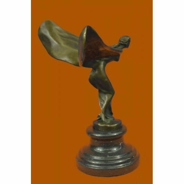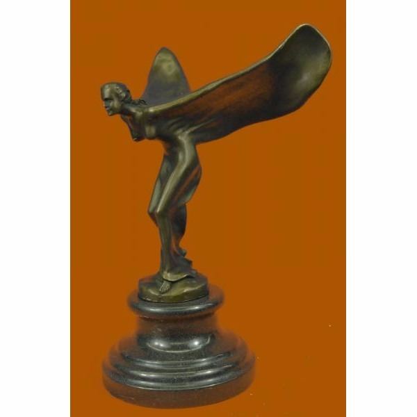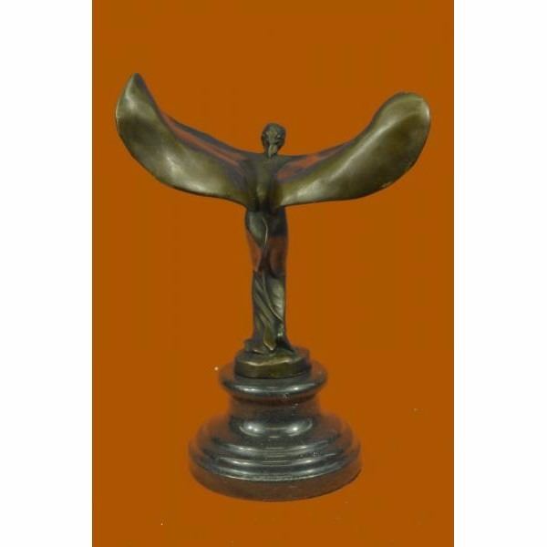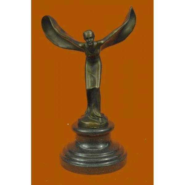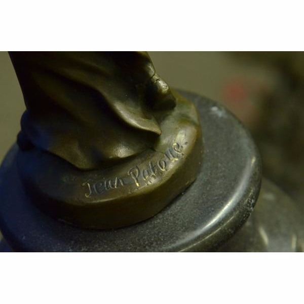 The bronze slender woman bends in a high bow. Both arms stretchbackwards bird-like as the definition of her limbs dissolve into wingsof fabric. Her head is posed straight at the beholder as her eyes seemto be mustering the levity for flight. Great details are possible inthe fabric because of the method of lost-wax casting used. She standsperched upon a black marble base and stained with a brown patinatarnish. The artist Jean Patoue's signature can be found on thisother worldly work of art. Condition: This sculpture is in perfect condition. Bronze Dimensions with Marble Base:Height 12" X Width 8" Marble Dimensions: Diameter 5.5" . Height without base: 9" Weight : 9 LBS Inventory: 54YRD12364745