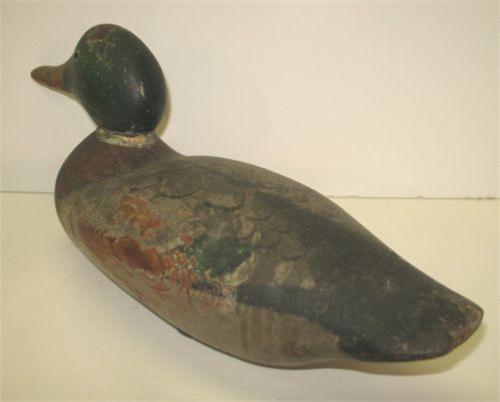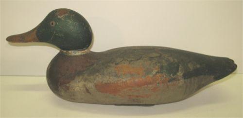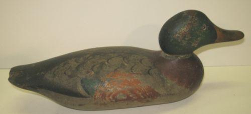 DETROIT, MICHIGAN MASON MALLARD DRAKE WORKING DECOY. Early 20th century. Damage to tail. Head has been reattached. Shows some loss to paint. Initialed on bottom “AF”.