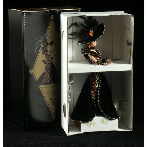 MASQUERADE BALL BARBIE BY BOB MACKIE: Masquerade Ball Barbie in original box. Box includes Masquerade Ball Barbie, standing pole, mask, and brush, with original documentation for Barbie, and reproduction of Bob Mackie's fashion illustration.