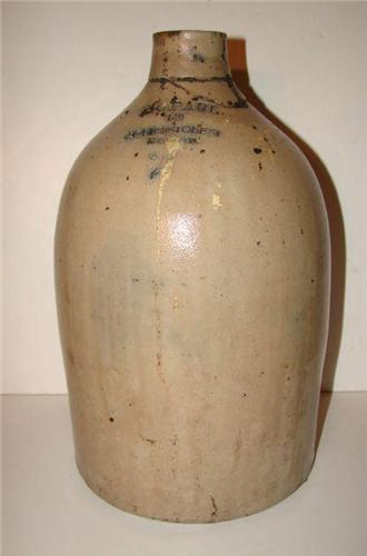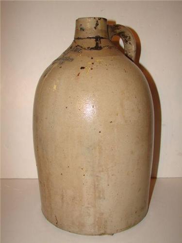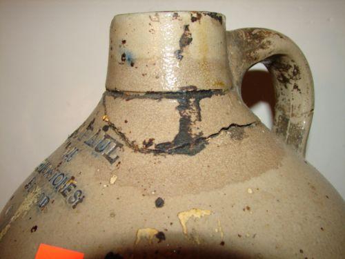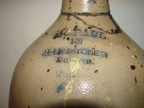 BOSTON, MASSACHUSETTS STONEWARE JUG. 2 gallons. Stamped with text at top of body near spout that reads “L.C. Paul/149/Blackstone St./Boston/2” in blue. Shows chipping at top rim of spout and major cracking at spout from reattachment. Shows crack at handle. Shows one chip at edge of base. 14.25” H