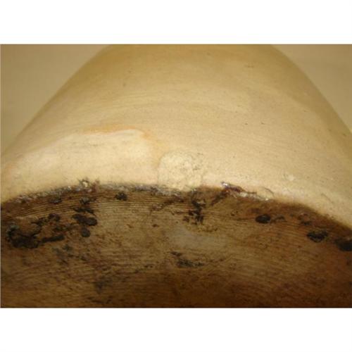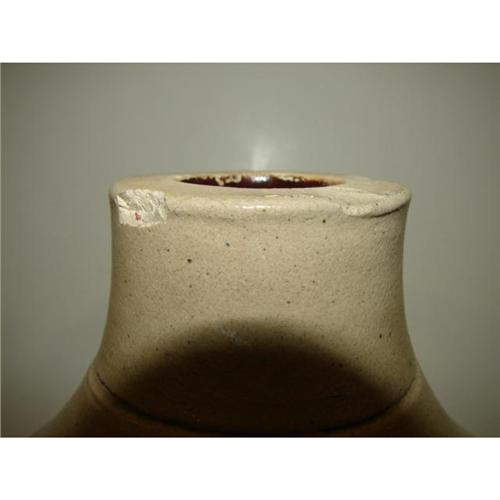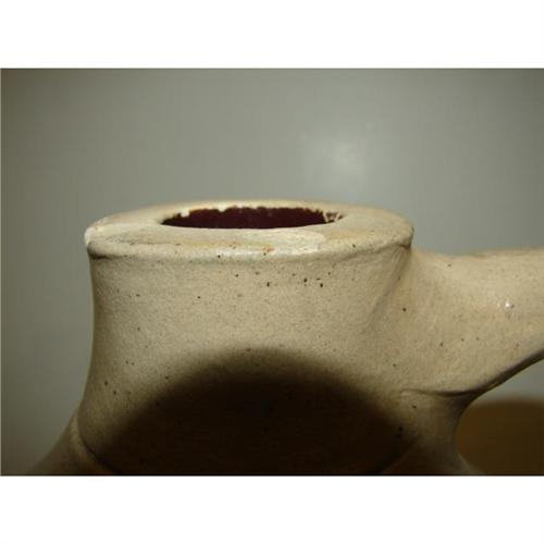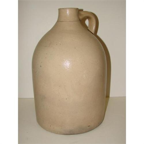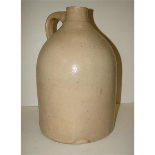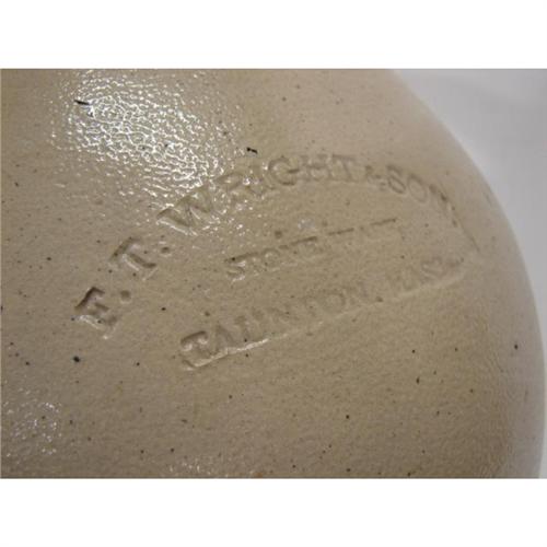 MASSACHUSETTS STONEWARE JUG. Stamped “F.T. Wright & Son/Taunton, Mass./Stoneware” at top of body. Shows three chips at spout and one chip at bottom edge. 14” H