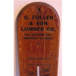 G. Fuller & Son Lumber Co. wooden thermometer. Marked on face "G. Fuller & Son Lumber Co., 550 Western Ave, Brighton 34, Mass." 11.25" H