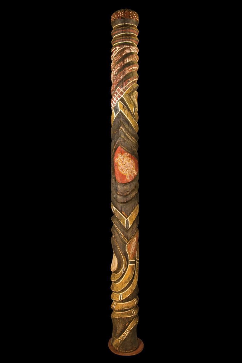 (1970) Here is a gorgeous carved aboriginal post by Ed Crissman. This was initially made for PVR but for one reason or another, was not used. This style was created as a standard for all signage posts at the resort. A much large version was mage by OA for the main resort marquee sign. This one is substantial, standing at over 10 feet tall. It was painted back in the 1970s by LeRoy Schmaltz features aboriginal ochers and designs. Mounted on a round base for partial stability however, this must be securely tethered as it will not safely stand upright on its own. Before bidding, be aware special freight requirements will be needed.10" diameter x 10'4" tall.VG+ with typical wear. *Blueprint for REFERENCE ONLY...not included with lot.