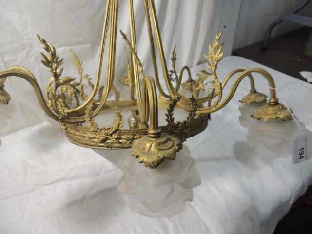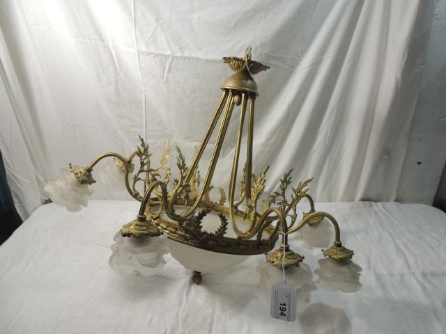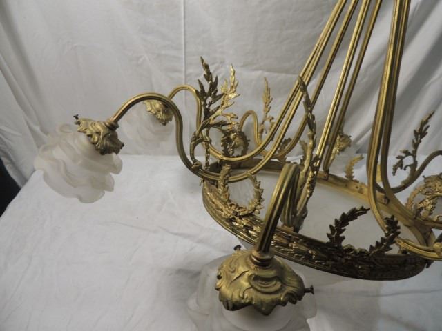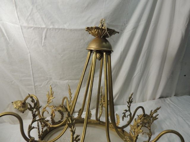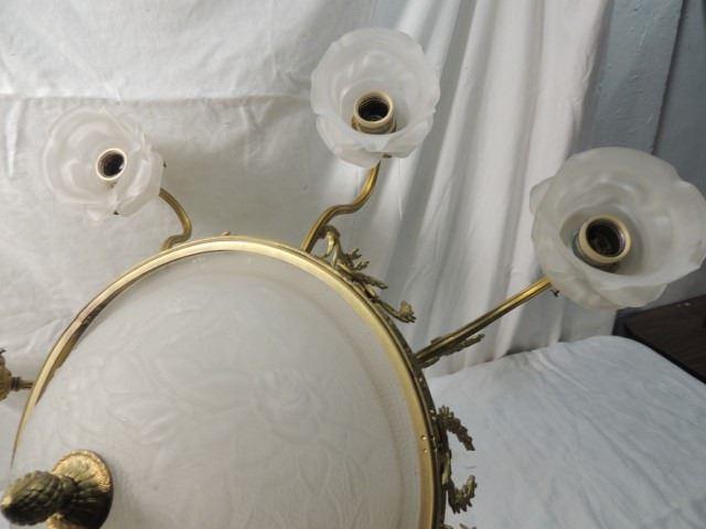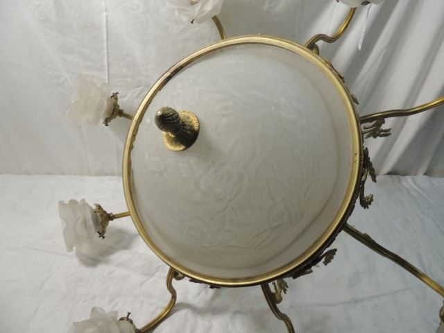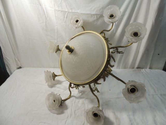 BEAUTIFUL HUGE GLASS AND BRASS ANTIQUE HANGING CHANDELIER LIGHT FIXTURE. CENTER LIGHTED AREA, AND 8 TEARDROP GLASS ARMS. PERFECT CONDITION. MEASURES 32" ACROSS, AND ABOUT 18" FROM THE TOP PENDANT HANGER, TO BE