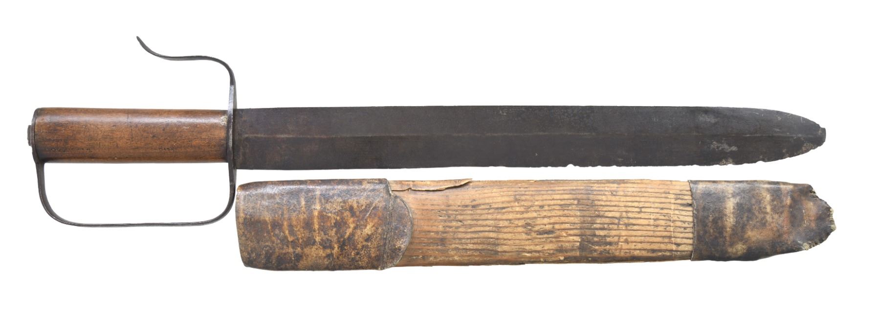 24" overall, 18" heavy wide spear point blade with medial ridge, oval wood handle, forged sculpted iron D-Guard with 4.5" extra-long tapered quillon with central ridge turned up for more hand protection, guard is attached with threaded tang & large hand forged nut. Sheath is made from 2 carved wood halves, that are secured by rawhide throat & tip. Wood scabbards and sheaths of this design are not uncommon to confederate arms but our most often pinned on edges. This one is unique in my observations of confederate bowies with raw hide; if other sheaths were made like this, there is no wonder why vast majority a big Confederate knives survive without their original sheaths. UNATTACHED ACCESSORIES: letter of authenticity from "Museum of Our Southern Heritage" 2005. CONDITION: very good overall, appears "as found", old shellac, mostly smooth dark iron patina, numerous small chips in cutting edge, tip is broken. Sheath is solid with numerous cosmetic chips & defects, but fits blade snuggly only in one direction as is typical of Confederate wooden sword scabbards which were carved exactly to fit a particular blade. PROVENANCE: Lifelong collection of Richard A. Baumann. (02-23364/JS). NON-GUN. $2,000-5,000.