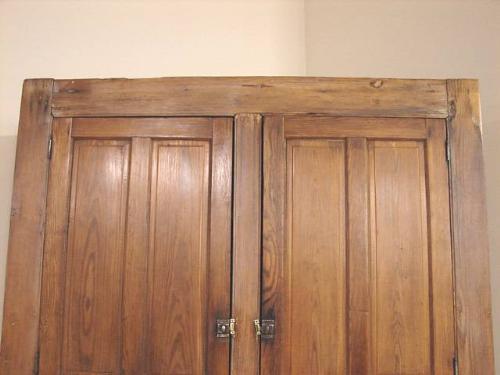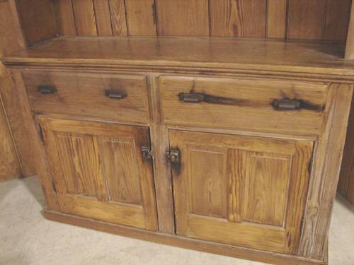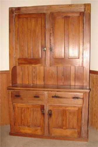 MASSIVE COUNTRY PINE STEP BACK CUPBOARD. Has two raised panel doors at top with two drawers over two raised panel doors at bottom. Shows some water staining throughout. 100” H, 62.5” W, 18.5” D